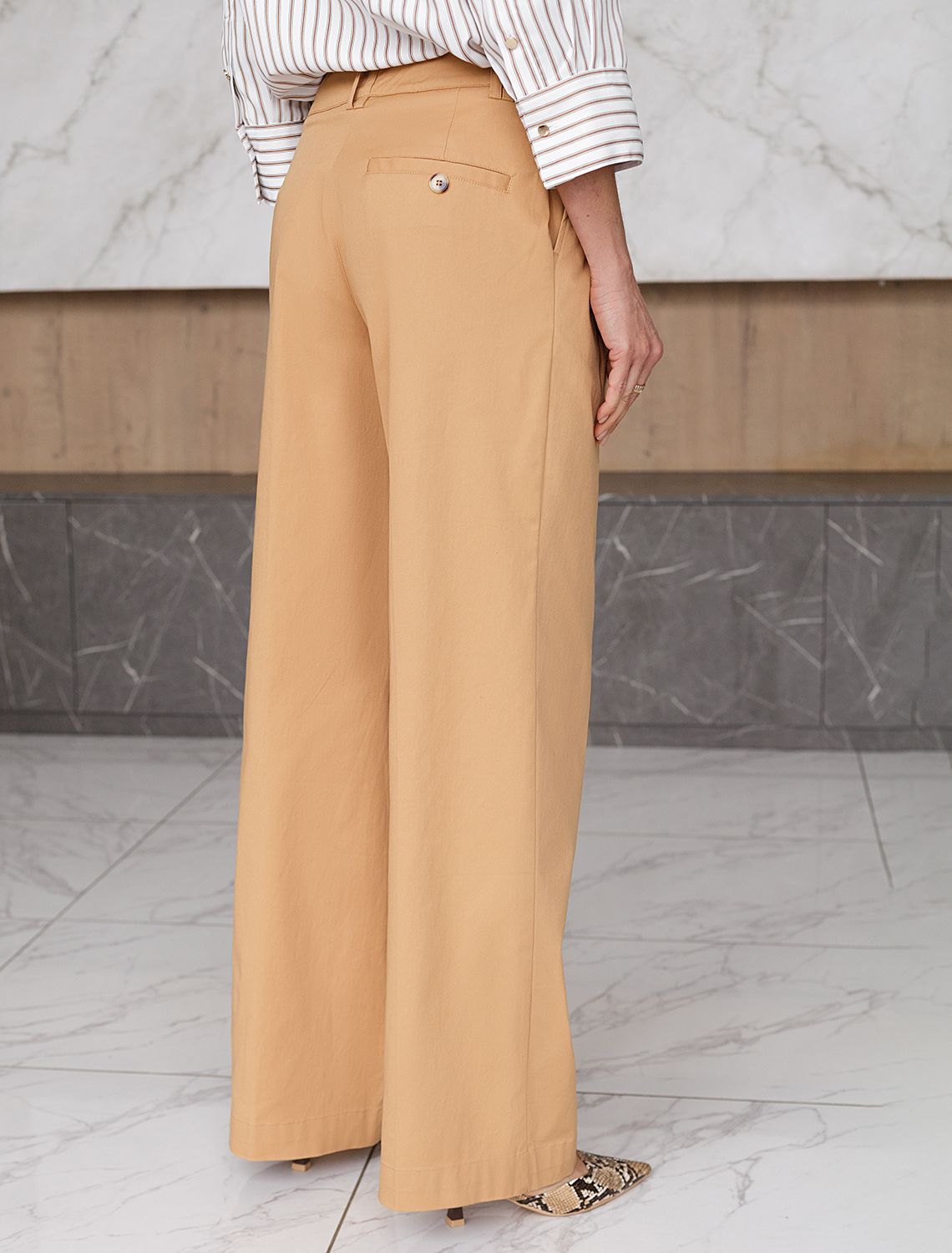 Брюки выполнены из хлопкового твила. Изделие дополнено двумя вариантами шлёвок, что позволяет использовать ремни разной ширины. Модель имеет два боковых и один задний карман. Защипы у пояса и стрелки вдоль брючины визуально вытягивают силуэт и подчеркивают талию. Благодаря наличию эластана в составе изделие сохранит свой безупречный внешний вид в течение долгого времени. Обладает высокой воздухопроницаемостью, в брюках будет комфортно даже в жаркое время года. темно-бежевый
