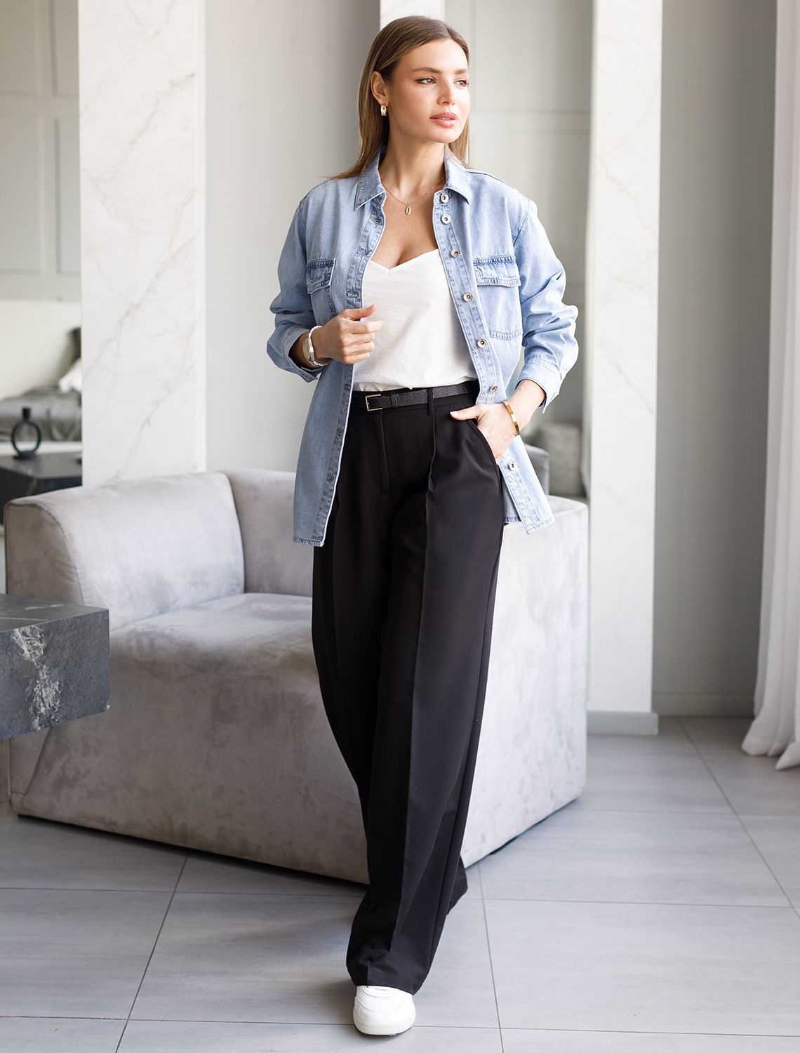 Брюки-палаццо выполнены из эластичной поливискозы. Легкая и струящаяся ткань идеально подойдет для повседневных образов. Модель с высокой посадкой визуально стройнит и вытягивает силуэт, удлиняет ноги. По верхнему краю спереди классически заложены складки, что придает свободы и простора в районе бедер. Свободный силуэт подходит для любой фигуры.