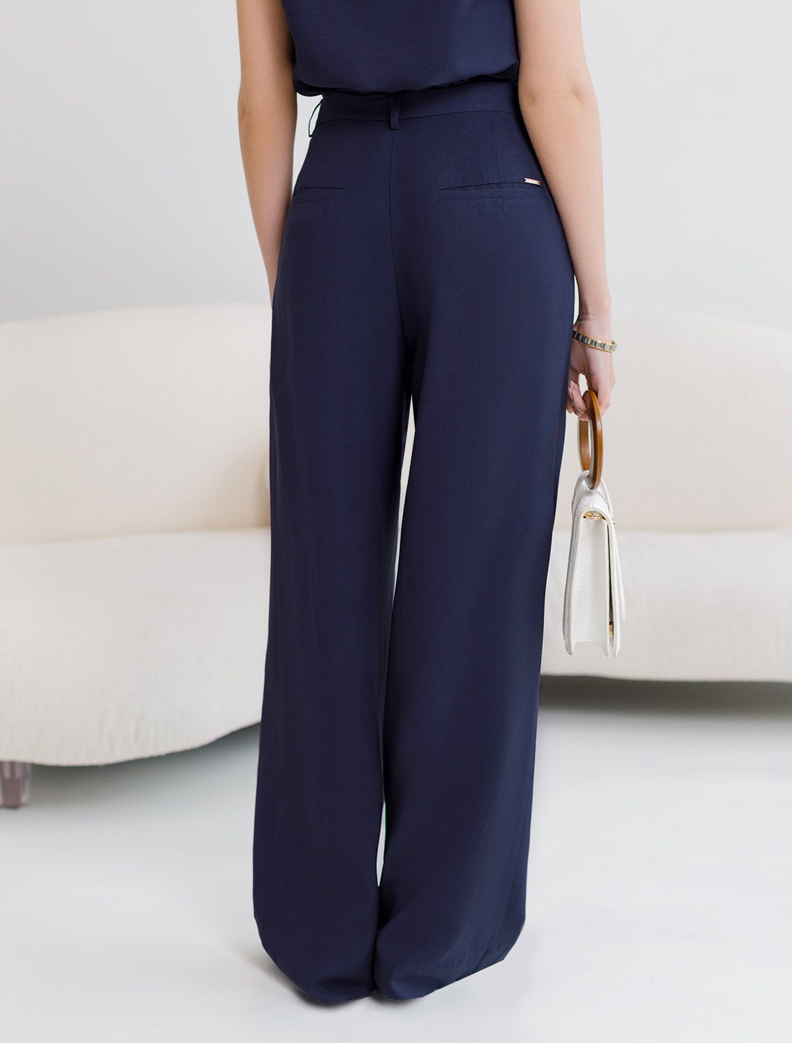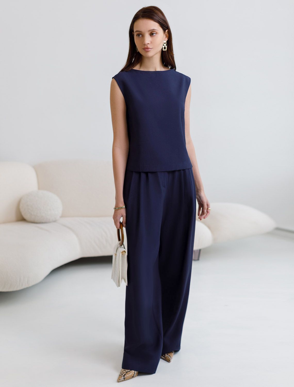 Брюки палаццо темно-синего цвета выполнены из плотного лиоцелла. Лиоцелл это более дорогой и экологичный вариант вискозы, очень прочный и шелковистый. Ткань отличается от регулярной коллекции из лиоцелла - она содержит еще больше лиоцелла (92%), благодаря чему имеет более нежную шелковистую фактуру. Свободные прямые брюки с высокой посадкой визуально вытягивают и стройнят фигуру. Удобные карманы по бокам и свободный крой делают эти брюки базовым элементом гардероба. Летние брюки отлично сочетаются с монохромным верхом, с ними можно создавать эффектные наряды как на выход, так и для ежедневных рабочих дел или простых прогулок, от делового шика до повседневного кэжуал. Комплект из лиоцелла подчеркнет ваш вкус и статус. Это идеальный выбор для особенных моментов. Такой образ будет уместен на торжественных мероприятиях и приемах, выпускных вечерах, семейных праздниках и свадьбах.