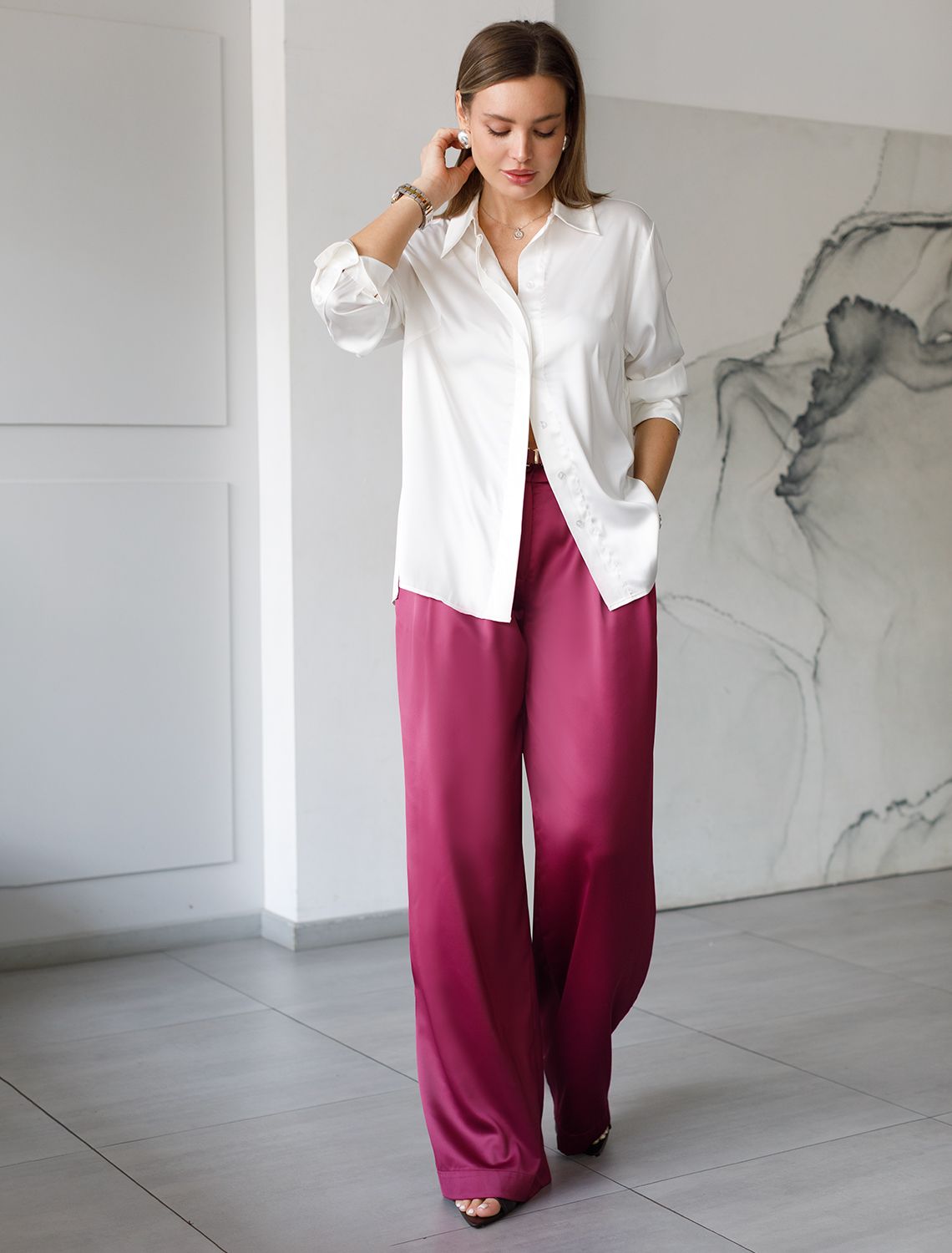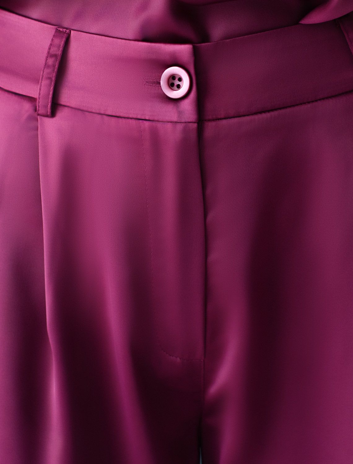 Брюки палаццо цвета бургунди из струящегося сатина, который придает образу эффектный и стильный вид. Мягкий сатин приятен к телу, в них комфортно на протяжении долгой носки. Брюки длиной в пол визуально вытягивают силуэт и подходят как для высоких, так и для женщин низкого роста. Модель идеально садится на большие размеры, не сковывая движений. Благородный материал обеспечивает не только привлекательный внешний вид, но и ощущение легкости в носке. Высокая посадка выгодно подчеркивает фигуру, добавляя изящества и современного шарма, они струятся при каждом движении.