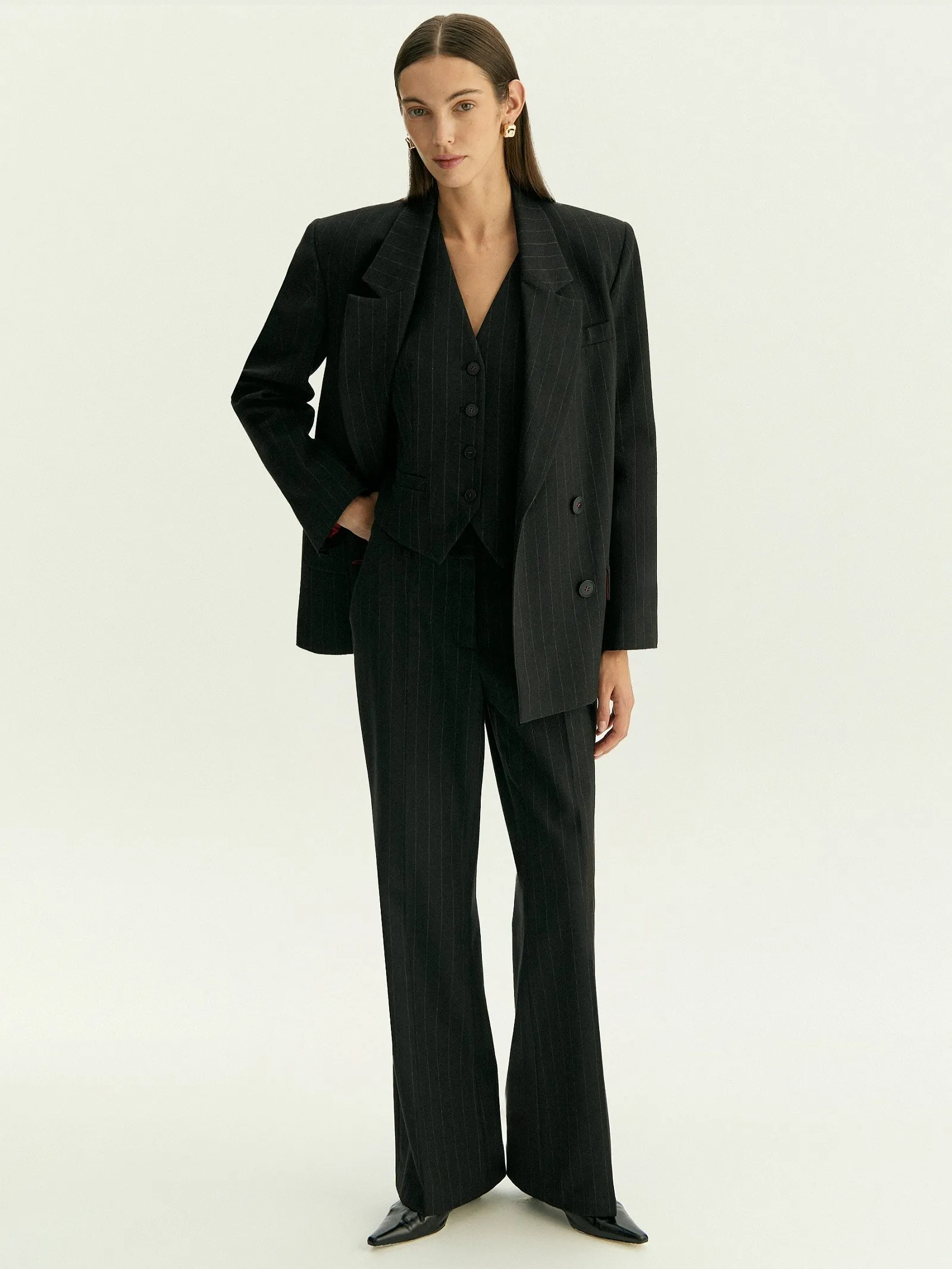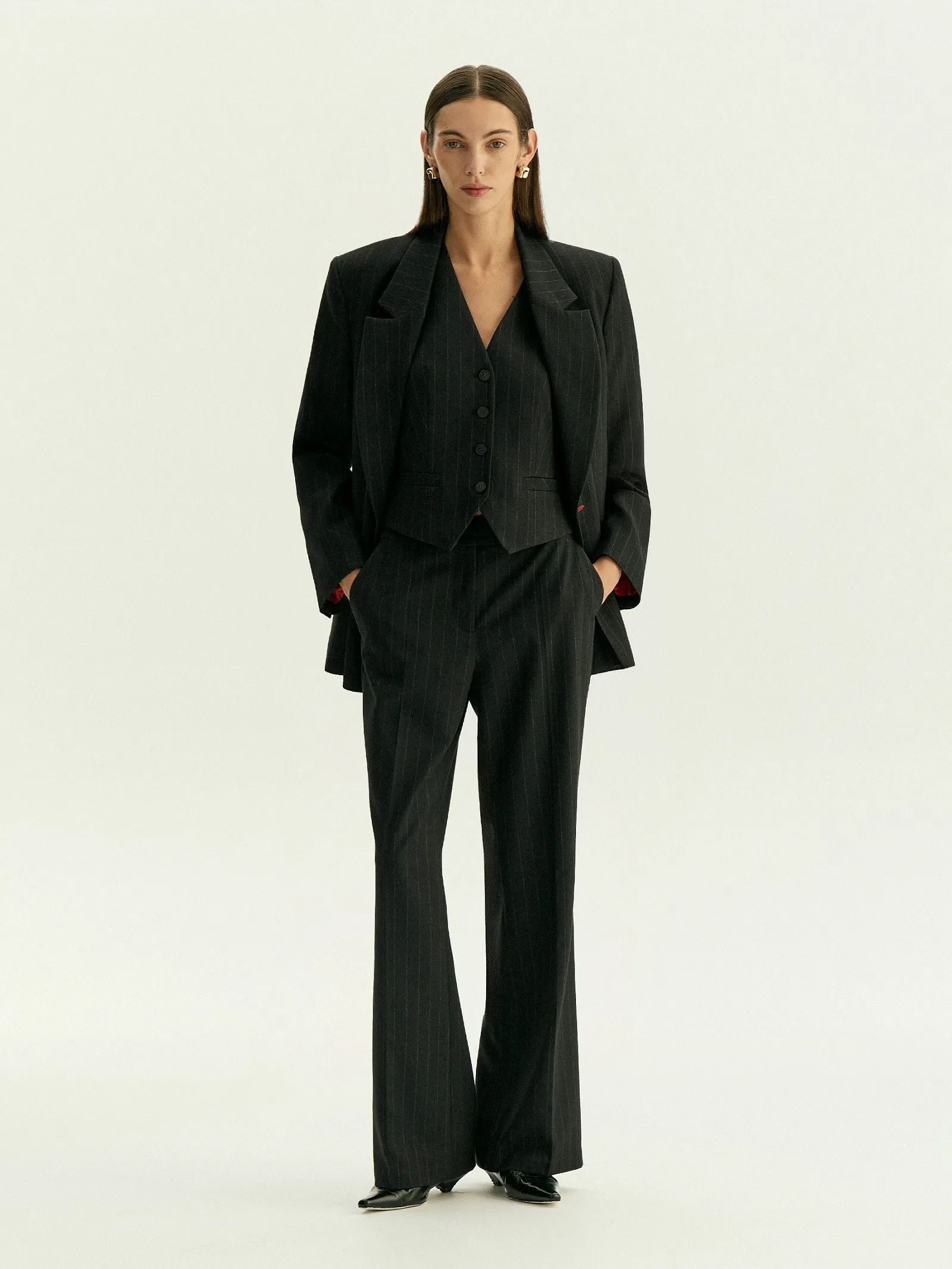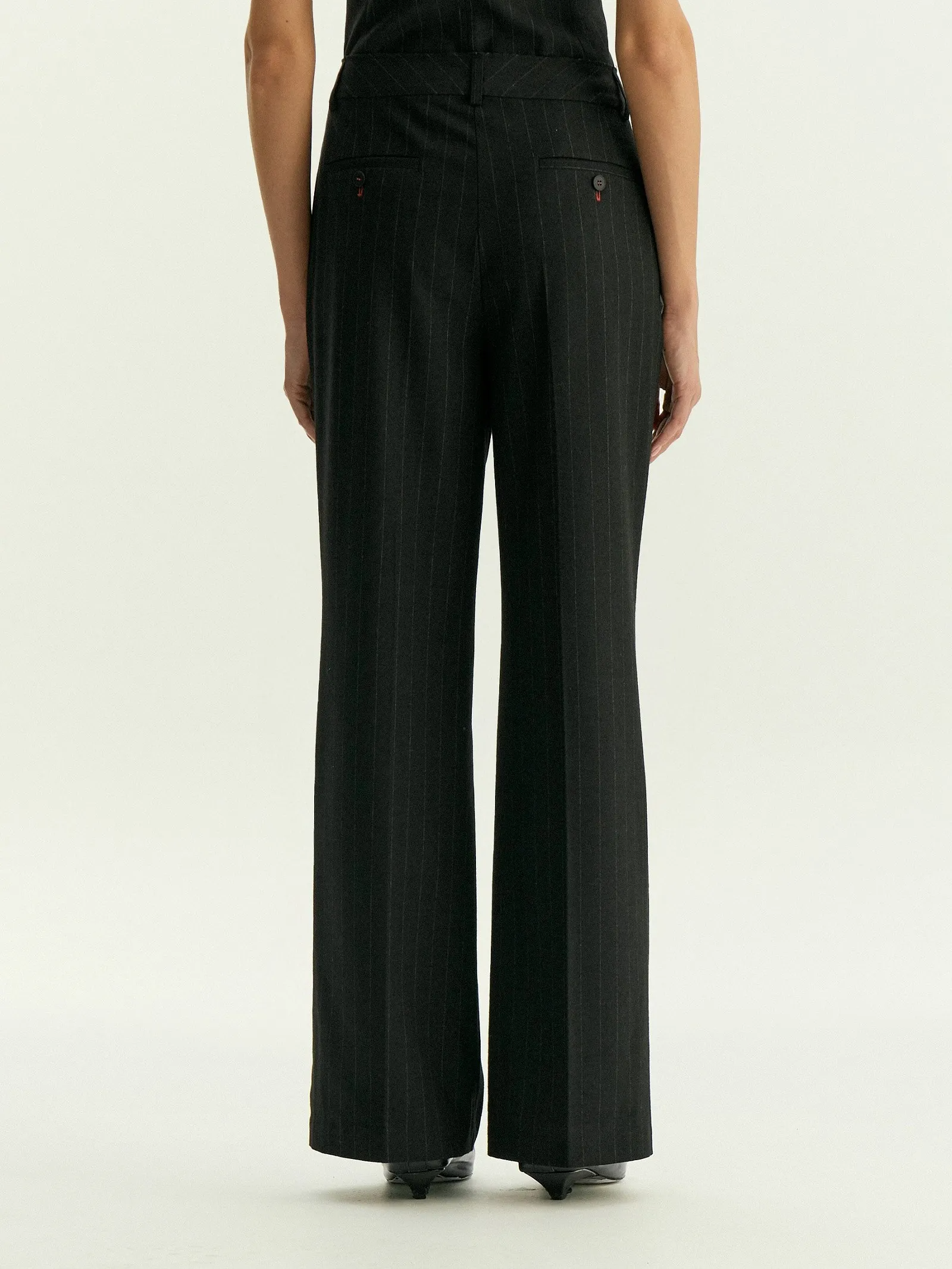 Чёрные брюки в полоску для стильных офисных выходов. Их изюминка — контрастные красные петли. Модель имеет среднюю посадку. Брюки могут стать частью капсулы с другими брюками, жакетом, жилетом и юбкой filch.