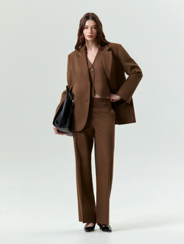 Брюки на каждый день в одном из главных цветов сезона — мокко. Сделаны из комфортного, мягкого материала, по ощущениям немного напоминающего байку. В составе — почти четверть шерсти и ещё четверть вискозы. Прямая модель с широким поясом имеет среднюю посадку. Образ можно дополнить жакетом или жилетом из комплекта stingray.