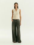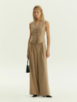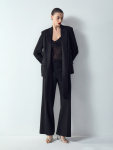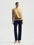 Тёмно-синие брюки в полоску с гранжевой отделкой. По верху идёт полоска необработанного края. Модель имеет среднюю посадку. Брюки могут стать частью капсулы с жакетом, жилетом и юбкой soprano