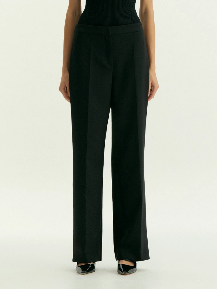 Чёрные брюки для классических офисных образов. Модель прямого кроя имеет среднюю посадку. Застёгивается на молнию и потайную застёжку. Завершить образ можно жакетом из комплекта