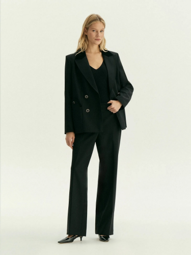 Чёрные брюки для классических офисных образов. Модель прямого кроя имеет среднюю посадку. Застёгивается на молнию и потайную застёжку. Завершить образ можно жакетом из комплекта