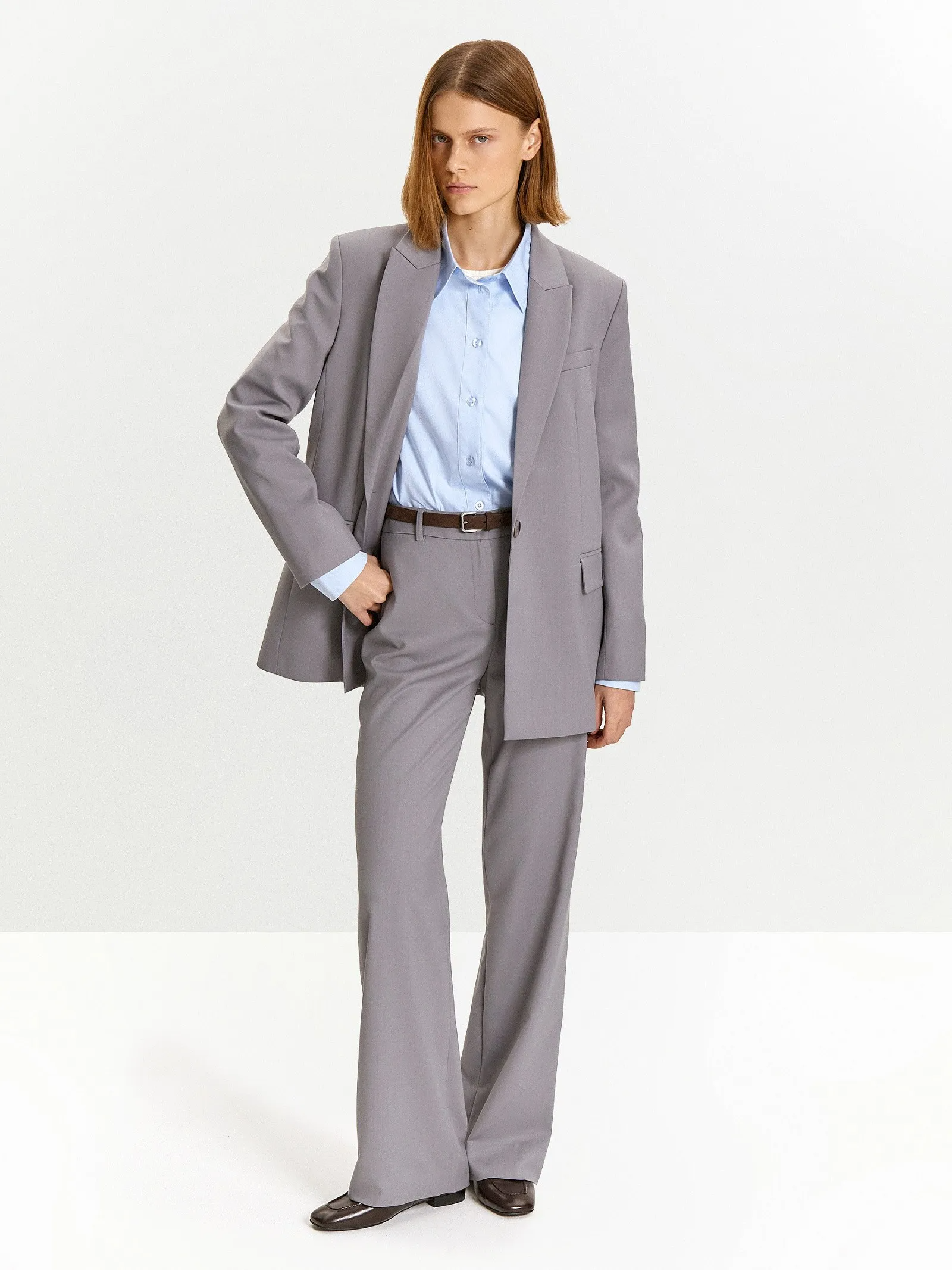 Классические серые брюки на каждый день. Материал на четверть состоит из шерсти, сделан с добавлением эластана для лучшей посадки. Модель прямого кроя с высокой посадкой и подкройным поясом дополнена застроченными складками спереди и вертикальными швами сзади. Брюки могут стать частью капсулы с юбкой и жакетом peter.