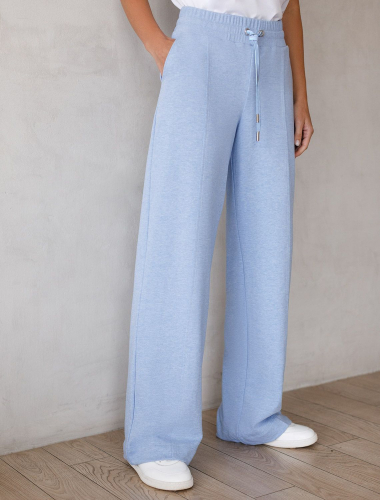 Брюки прямого кроя с удобным эластичным поясом на резинке и карманами по бокам выполнены из премиального футера-двухнитки. Наличие эластана в составе гарантирует комфорт и долговечность изделия, материал хорошо пропускает воздух, позволяя телу дышать.. Эти уютные брюки нежного голубого цвета с эффектом меланж созданы для вашего комфорта. Свободный прямой крой обеспечивает свободу движений и максимальное удобство в любых ситуациях, поэтому они подойдут и на большие размеры, а так же на высокий или низкий рост. Фигура подчеркивается, а силуэт визуально вытягивается за счет кроя палаццо и застроченных декоративных стрелок. Вы можете создать стильный образ на каждый день в сочетании с джемпером D49.139 и бомбером D49.141. В повседневных трикотажных брюках вы будете чувствовать себя комфортно и уверенно, наслаждаясь каждым моментом дня.