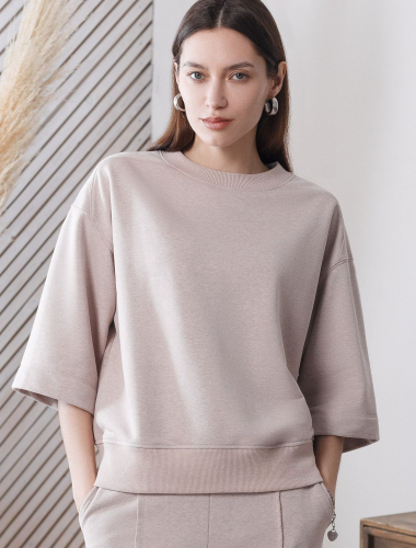 Брюки прямого кроя с удобным эластичным поясом на резинке и карманами по бокам выполнены из премиального футера-двухнитки. Наличие эластана в составе гарантирует комфорт и долговечность изделия, материал хорошо пропускает воздух, позволяя телу дышать.. Эти уютные брюки нежного цвета макиато с эффектом меланж созданы для вашего комфорта. Свободный прямой крой обеспечивает свободу движений и максимальное удобство в любых ситуациях, поэтому они подойдут и на большие размеры, а так же на высокий или низкий рост. Фигура подчеркивается, а силуэт визуально вытягивается за счет кроя палаццо и застроченных декоративных стрелок. Вы можете создать стильный образ на каждый день в сочетании с джемпером D49.139 и бомбером D49.141. В повседневных трикотажных брюках вы будете чувствовать себя комфортно и уверенно, наслаждаясь каждым моментом дня.