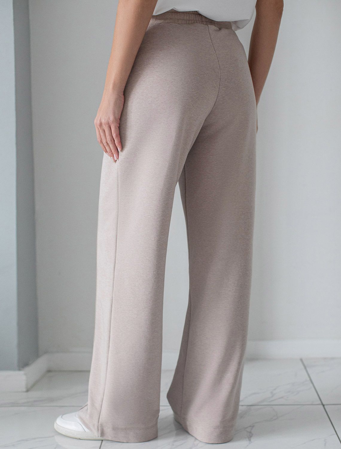 Брюки прямого кроя с удобным эластичным поясом на резинке и карманами по бокам выполнены из премиального футера-двухнитки. Наличие эластана в составе гарантирует комфорт и долговечность изделия, материал хорошо пропускает воздух, позволяя телу дышать.. Эти уютные брюки нежного цвета макиато с эффектом меланж созданы для вашего комфорта. Свободный прямой крой обеспечивает свободу движений и максимальное удобство в любых ситуациях, поэтому они подойдут и на большие размеры, а так же на высокий или низкий рост. Фигура подчеркивается, а силуэт визуально вытягивается за счет кроя палаццо и застроченных декоративных стрелок. Вы можете создать стильный образ на каждый день в сочетании с джемпером D49.139 и бомбером D49.141. В повседневных трикотажных брюках вы будете чувствовать себя комфортно и уверенно, наслаждаясь каждым моментом дня.
