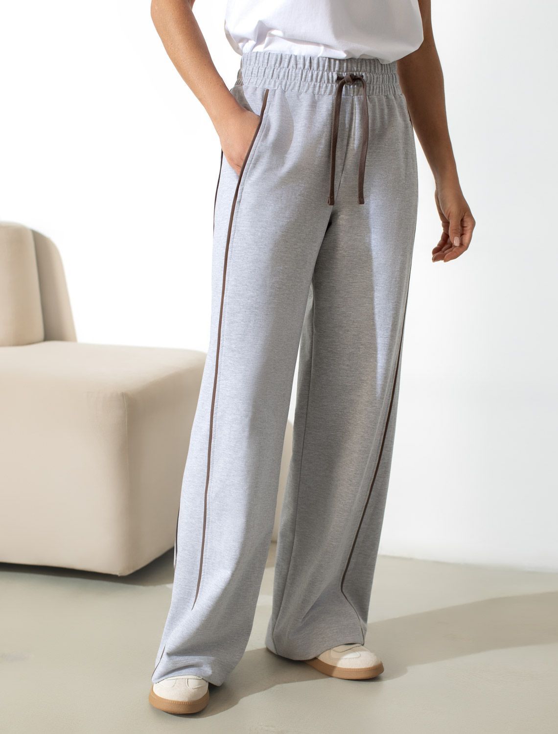 Прямые брюки светло-серого цвета с эффектом меланж из премиального футера двухнитки с эластаном сочетает в себе комфорт и оригинальность. Брюки выполны из натурального хлопка, который обеспечивает мягкость и дышащие свойства ткани. Нежный материал дарит ощущение уюта в любое время года, а премиальное качество изготовления гарантирует долговечность и сохранение формы после множества стирок. Лампасы добавляют динамики и вытягивают силуэт. Принт в виде надписи придает индивидуальность, позволяя выделиться без лишней вычурности.
