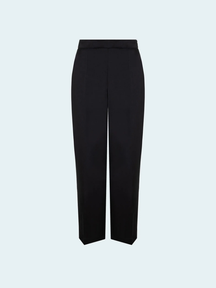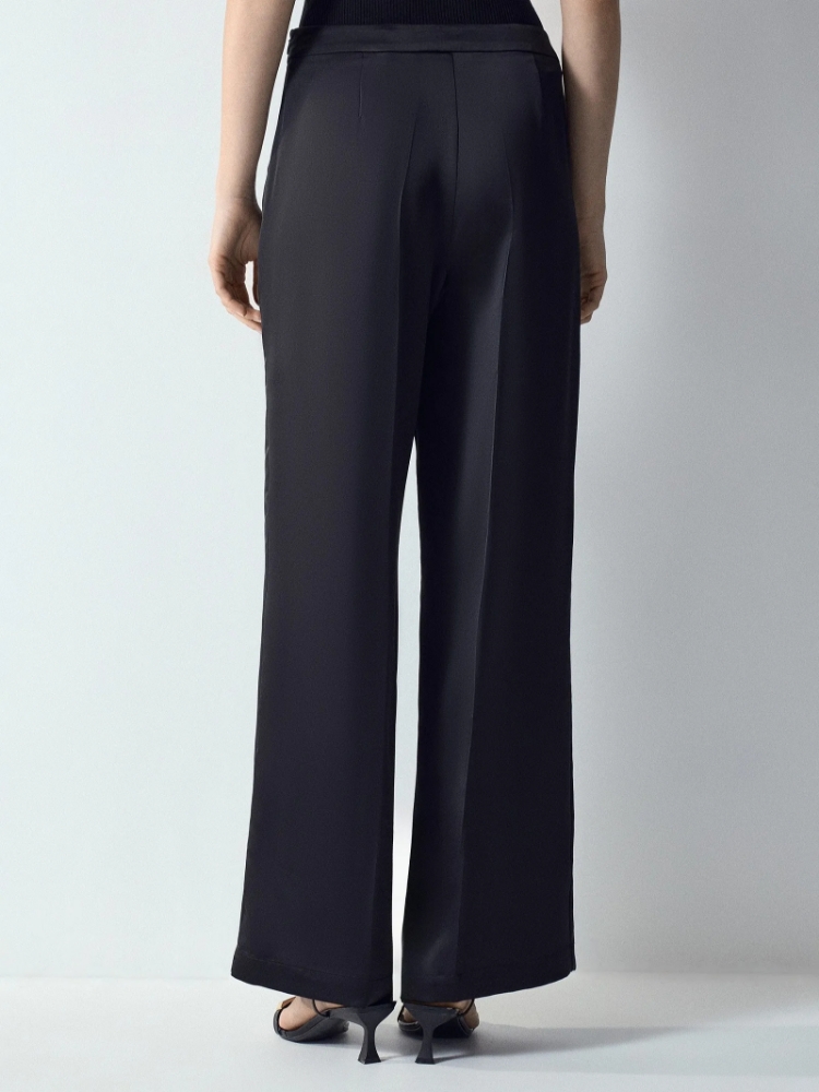 Чёрные брюки со стрелками из материала с глянцевитым блеском стильно смотрятся в повседневных и праздничных образах. Модель широкого кроя имеет среднюю посадку. Застёгивается на молнию. Брюки выполнены из вискозы. Дополнить образ можно любым базовым или акцентным верхом