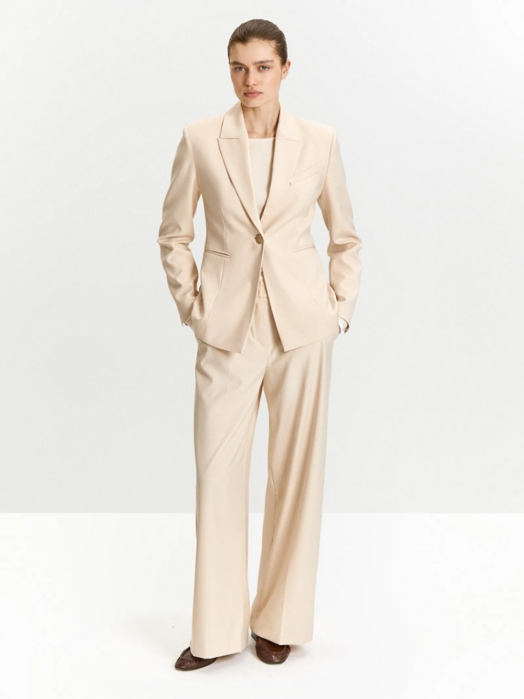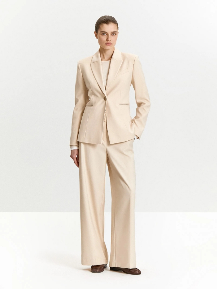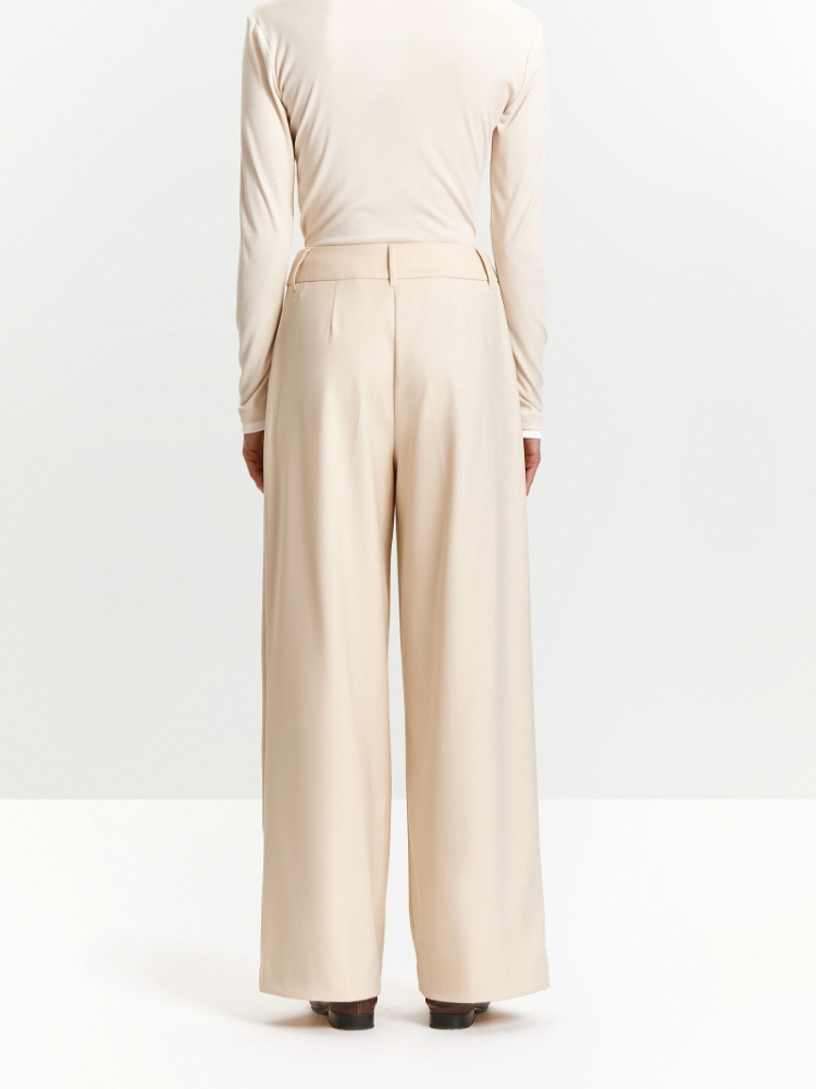 Брюки палаццо в спокойном молочно-бежевом оттенке — незаменимая вещь. Станут основой повседневных образов на лето и аутфитов к особому случаю — достаточно добавить нарядную блузу. Модель отличает широкий подкройной пояс. По бокам располагаются аккуратные прорезные карманы. Изделие выполнено из материала с высоким содержанием вискозы, без подкладки