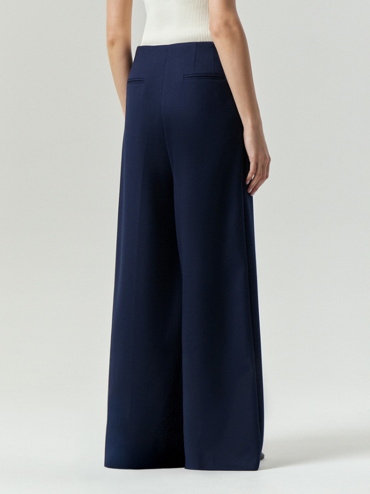 Брюки широкого кроя с посадкой на бёдрах сочетают сдержанность офисного стиля и расслабленность. Материал в насыщенном тёмно-синем цвете с содержанием вискозы на ощупь напоминает плотный трикотаж. Брюки визуально формируют красивую линию бедра. Завершить образ с брюками можно жакетом из комплекта, полосатой рубашкой, воздушным сатиновым топом молочного цвета или тельняшкой. Модель большемерит на один размер