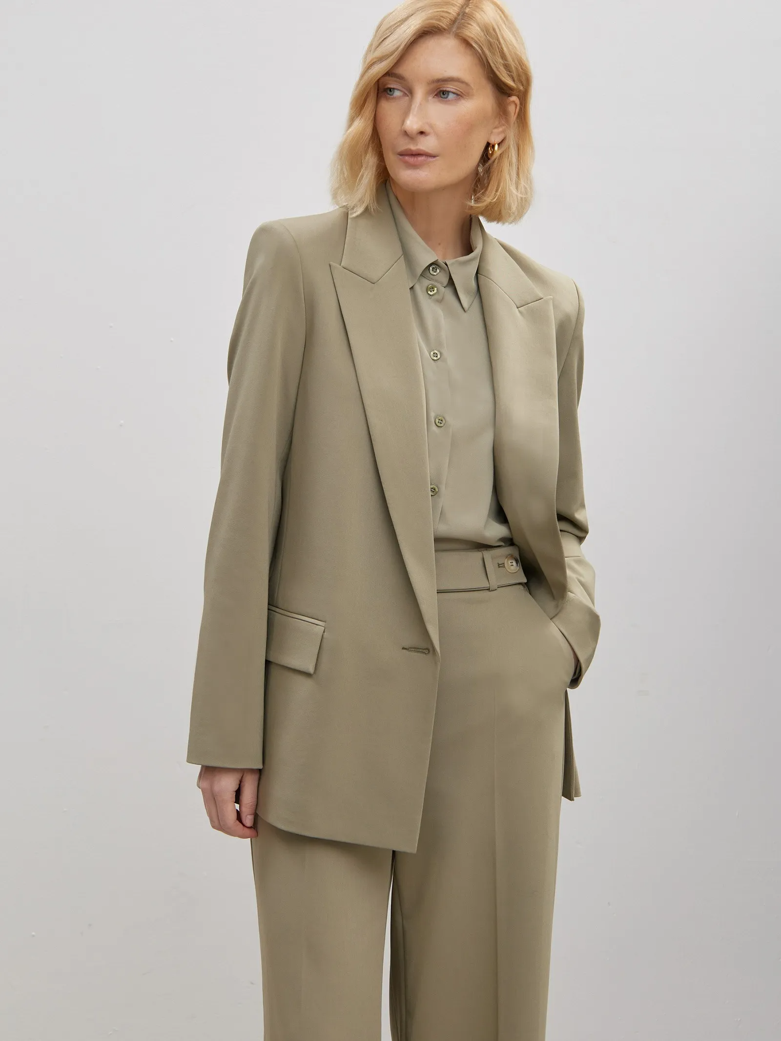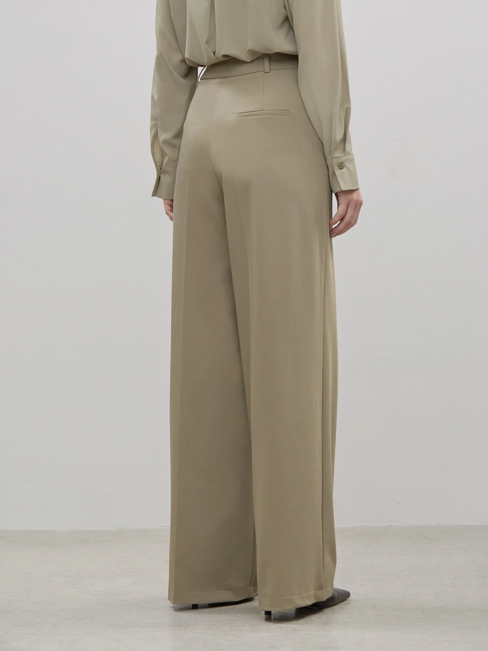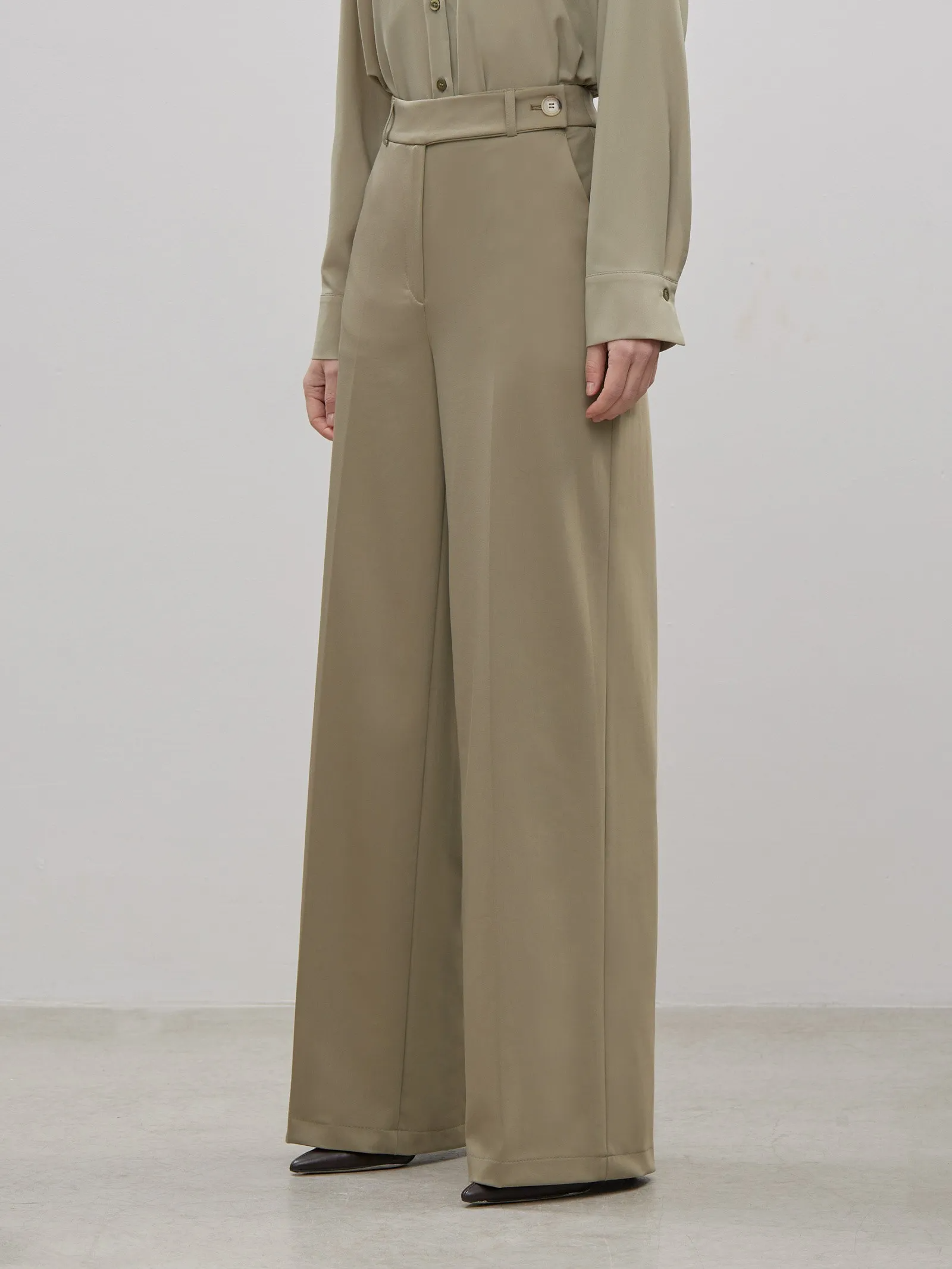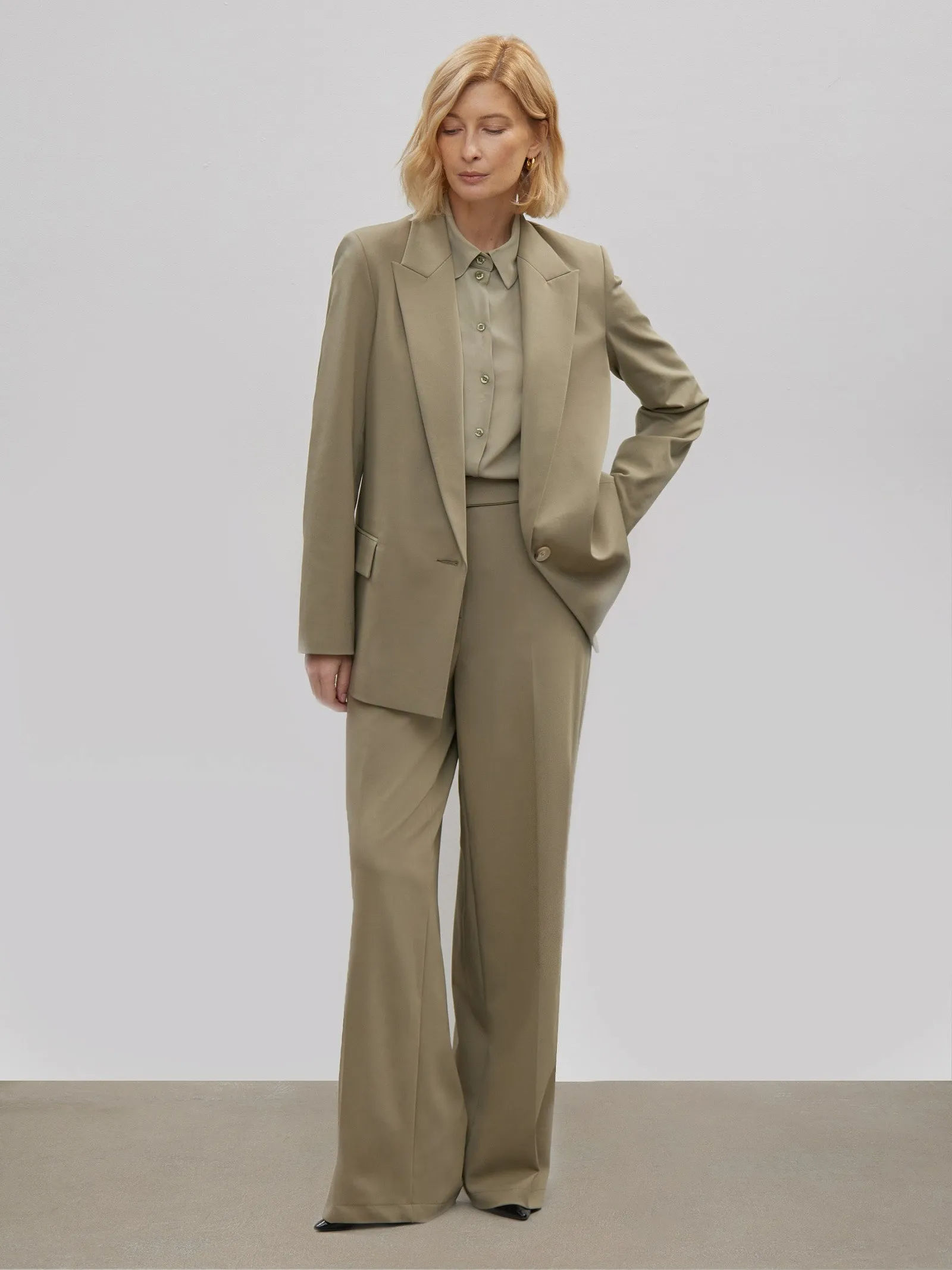 Элегантные брюки в красивом оливковом цвете. Модель широкого кроя с высокой посадкой отличает пуговица сбоку. Дополнить образ можно жакетом из комплекта. Изделие выполнено из материала с высоким содержанием вискозы.
