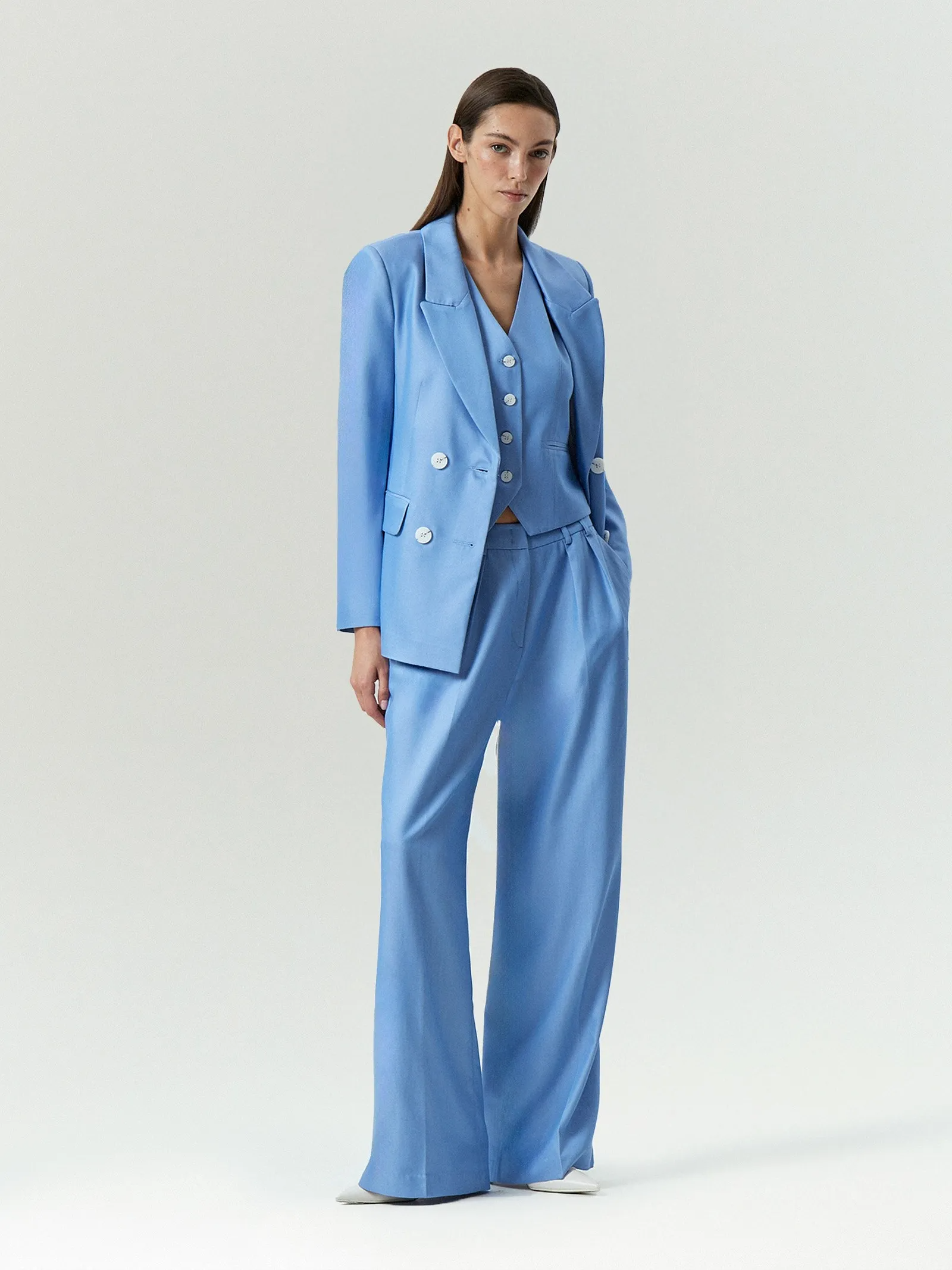 Брюки в притягательном голубом цвете подойдут как для будней, так и особых случаев. Элегантная модель с защипами имеет высокую посадку и широкий крой. Застёгивается на молнию и потайную застёжку под планкой. Сзади располагаются декоративные узкие карманы с листочкой и шлёвки для ремня. Завершить образ можно жилетом и жакетом из комплекта.