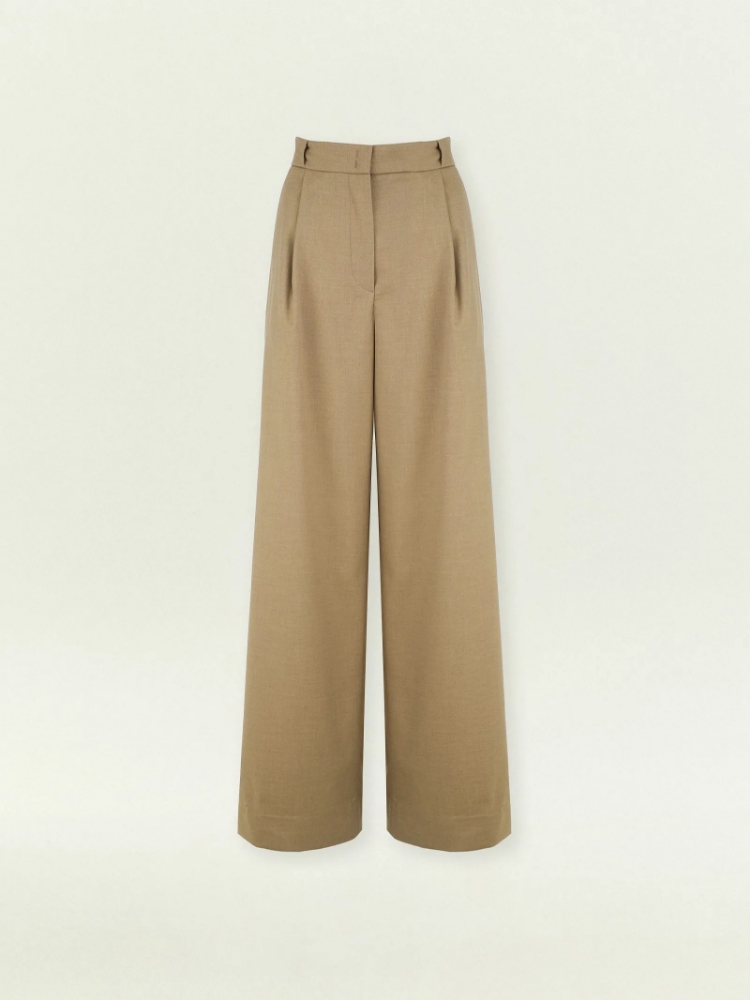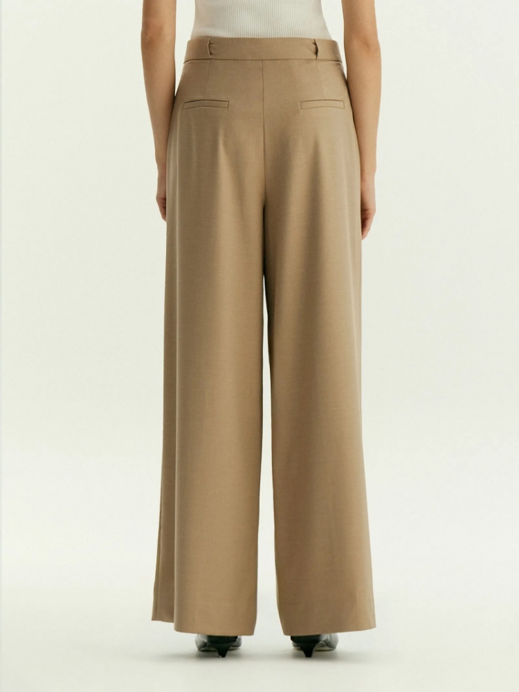 Модные брюки на каждый день. Богатый оттенок бежевого сделает деловые образы ещё более стильными. В составе материала — шерсть для тепла, вискоза для мягкости и эластан для комфортной посадки. Элегантная модель полной длины с глубокими защипами и потайной застёжкой имеет модный широкий крой. Изделие выполнено без подкладки. Брюки могут стать частью капсулы с юбкой и жилетом ant