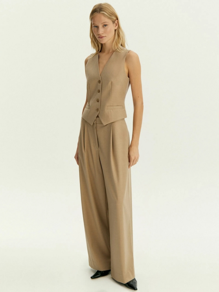 Модные брюки на каждый день. Богатый оттенок бежевого сделает деловые образы ещё более стильными. В составе материала — шерсть для тепла, вискоза для мягкости и эластан для комфортной посадки. Элегантная модель полной длины с глубокими защипами и потайной застёжкой имеет модный широкий крой. Изделие выполнено без подкладки. Брюки могут стать частью капсулы с юбкой и жилетом ant