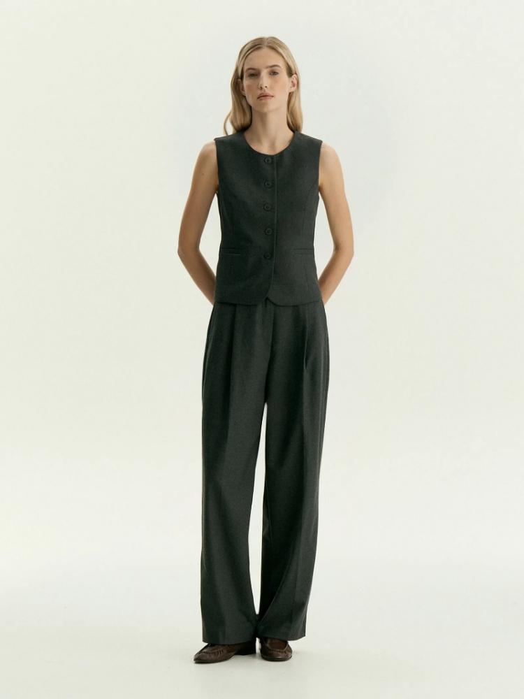 Брюки станут основой множества ансамблей. С ними можно создать и деловой образ, и праздничный. Модель отличают широкий пояс с потайной застёжкой и планкой сбоку, стильная завышенная посадка и широкий крой. Плотная и мягкая костюмная поливискоза не мнётся, хорошо держит форму, при движении ложится красивыми мягкими складками. Изделие выполнено без подкладки. Завершить образ можно жилетом из комплекта или женственной атласной блузой
