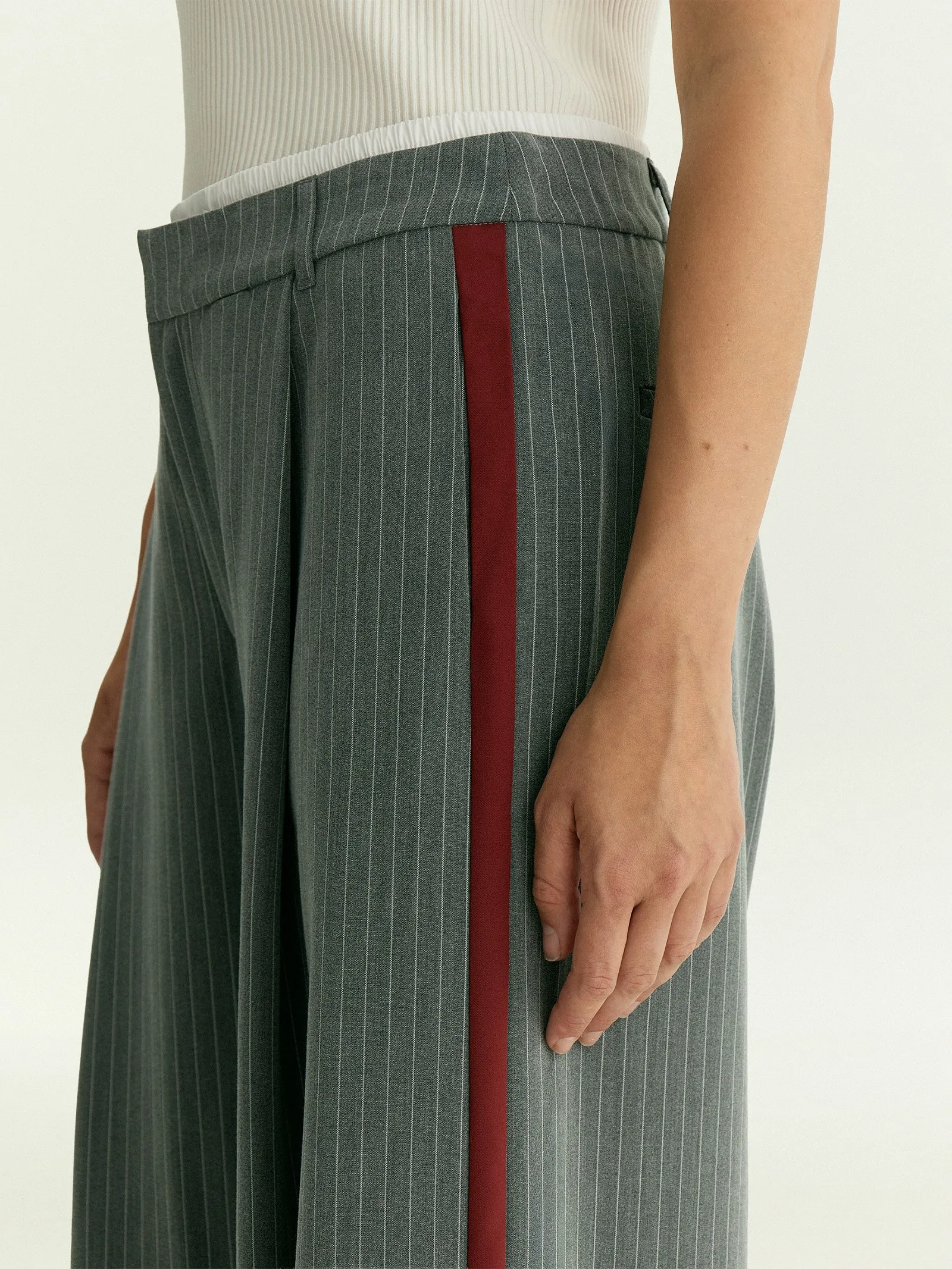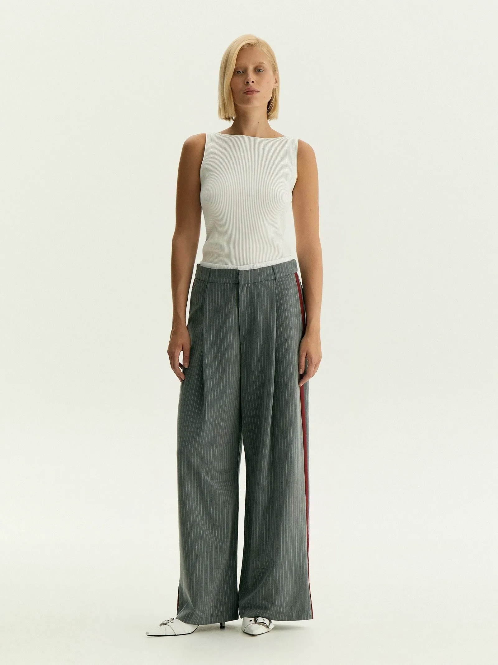 Светло-серые брюки в полоску выделяют красные лампасы и имитация выпущенной отделки поясной части. Также модель дополнена защипами и функциональными прорезными карманами по бокам. Брюки сделаны из очень приятной к телу ткани. В составе есть спандекс для ещё более комфорной посадки. Изделие выполнено без подкладки.