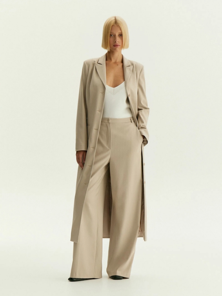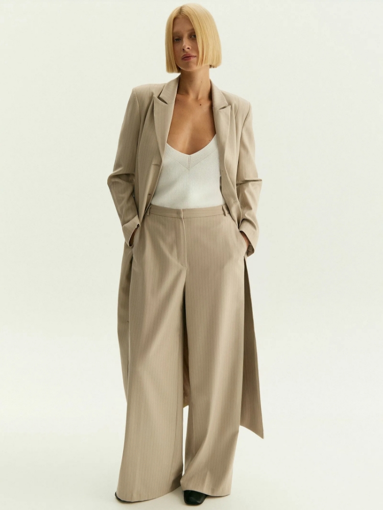 Стильные брюки в офис и для нерабочих планов. Модель широкого кроя и полной длины с высокой посадкой смотрится актуально. Имеет практичные карманы по бокам. Брюки выполнены в универсальном молочно-бежевом оттенке и украшены тонкой полоской. Один из главных принтов сезона не теряет актуальность, смотрится элегантно и уместен в деловом гардеробе. В составе материала — дышащая вискоза и эластан для ещё более комфорной посадки. Завершить образ можно платьем-жакетом из комплекта или другим верхом по вкусу