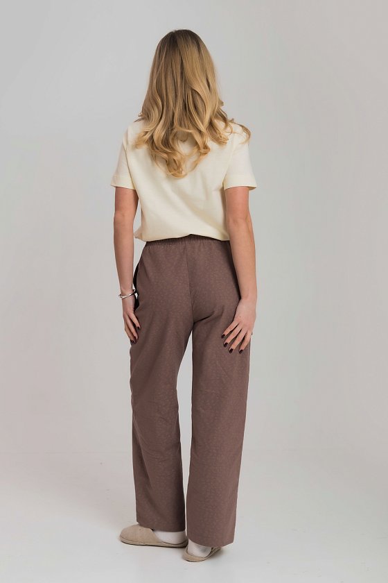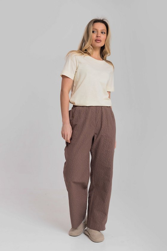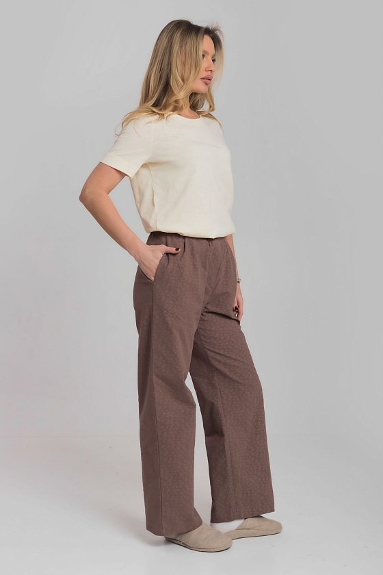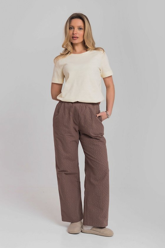 Брюки свободного кроя выполнены из мягкого рубашечного шерона на хлопковой основе. Материал легкий, приятный к телу и хорошо дышит. Пояс на комфортной резинке обеспечивает удобную посадку, а боковые карманы добавляют функциональности. Идеальный вариант для домашнего отдыха и повседневного комфорта.