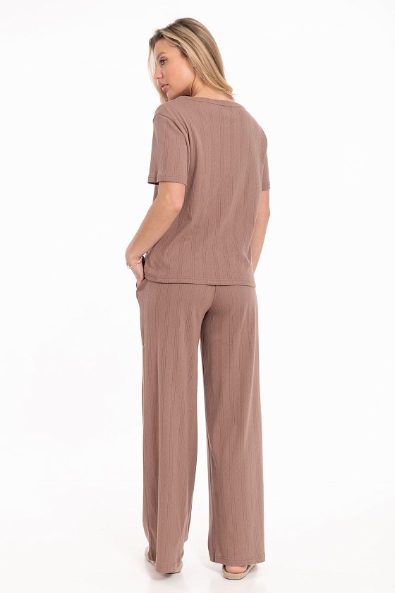 Брюки выполнены из мягкой трансферной рибаны, обеспечивающей полную свободу движений и комфорт. Модель широкого кроя со средней посадкой создаёт расслабленный и современный силуэт. Функциональные боковые карманы и пояс на резинке делают эти брюки максимально удобными для повседневной носки. Этот универсальный вариант идеально подойдёт для домашнего отдыха.