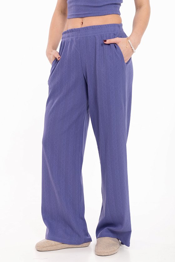 Брюки выполнены из мягкой трансферной рибаны, обеспечивающей полную свободу движений и комфорт. Модель широкого кроя со средней посадкой создаёт расслабленный и современный силуэт. Функциональные боковые карманы и пояс на резинке делают эти брюки максимально удобными для повседневной носки. Этот универсальный вариант идеально подойдёт для домашнего отдыха.