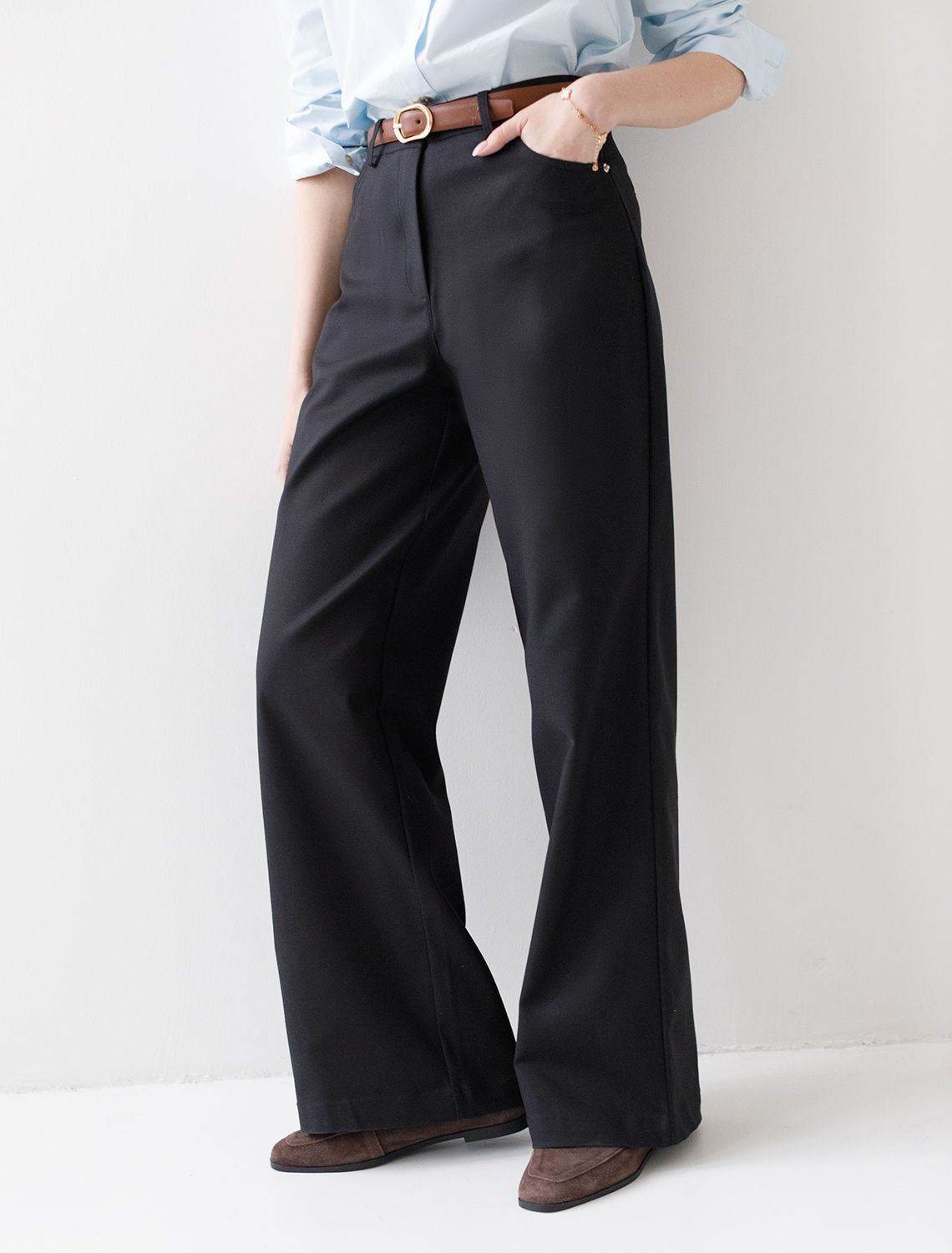 Брюки-трубы выполнены из плотной хлопковой эластичной ткани с добавлением нейлона. Любимая классика делового стиля, которая должна быть в любом гардеробе, так как такая вещь практична и многофункциональна. Для особого случая на важной встрече в паре с блузкой или для офисного дресс-кода с топом и жакетом. В повседневной жизни с более неформальным верхом и обувью на высоком или низком каблуке. черный