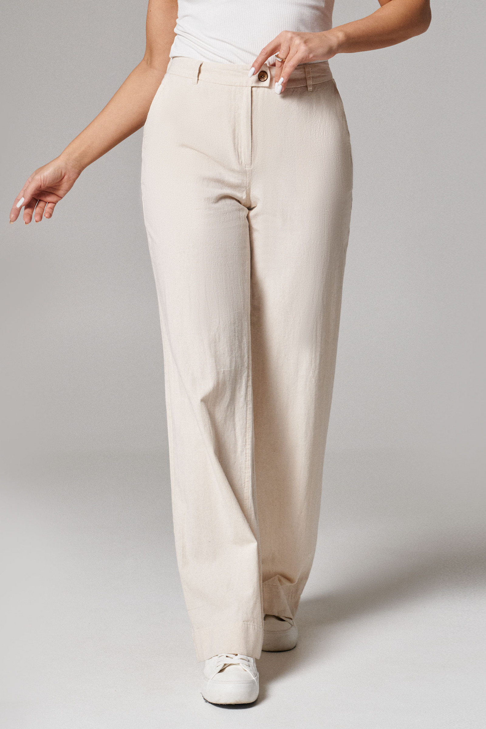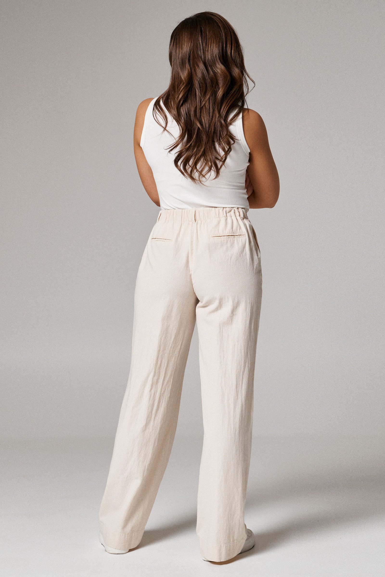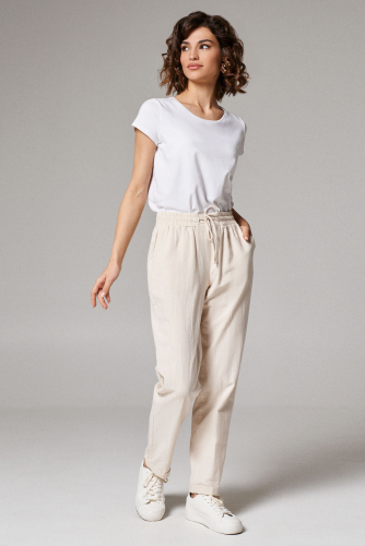 Брюки женские из хлопковой ткани для повседневной носки. Брюки прямого кроя на поясе. По переду прорезные карманы в боковых швах. Застежка фронтальная на молнию и пуговицу. В заднюю часть пояса вставлена резинка. На задних частях брюк имеются прорезные карманы в рамку.