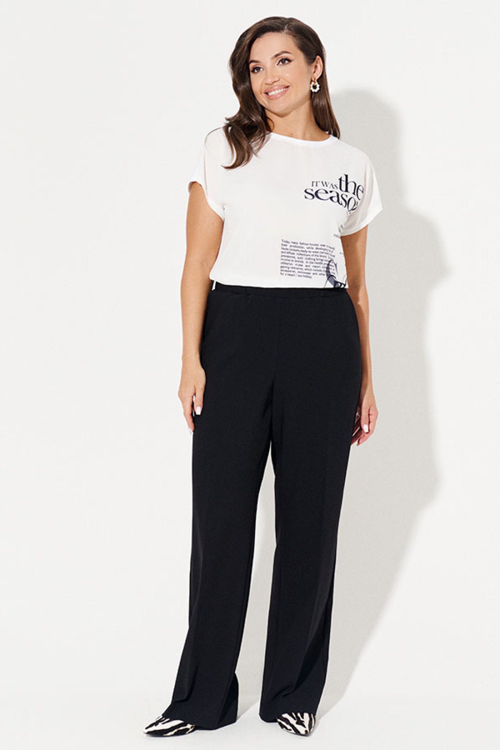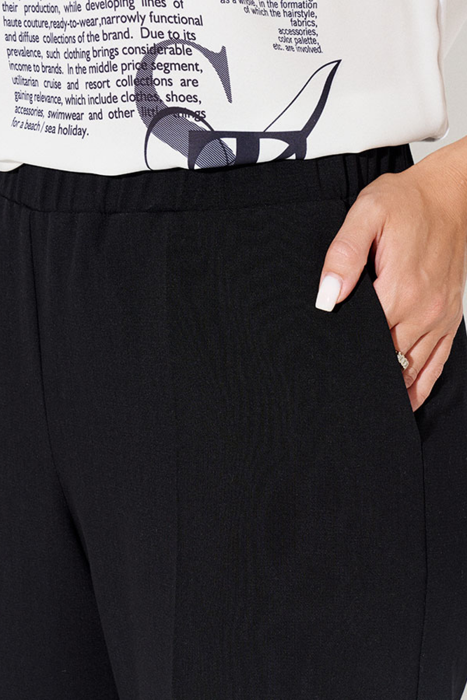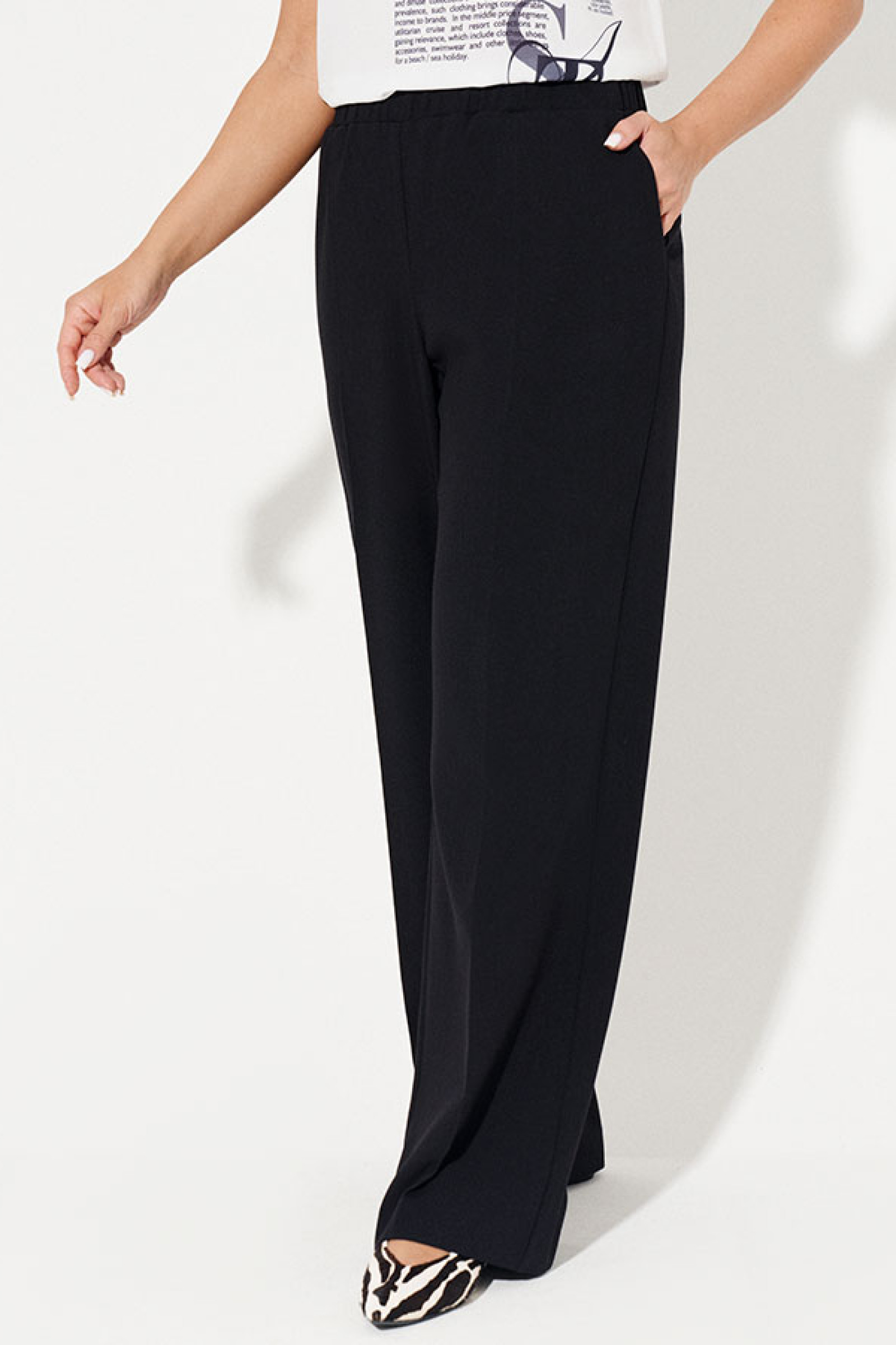 Брюки из смесовой ткани для повседневной носки прямого силуэта. Верхний срез брюк обработан притачным поясом на резинке. В боковых швах располагаются прорезные карманы с подкройным бочком. Изделие классической длины. Очень стильные и удобные брюки, в которых вам будет комфортно на любом мероприятии или же прогулке.