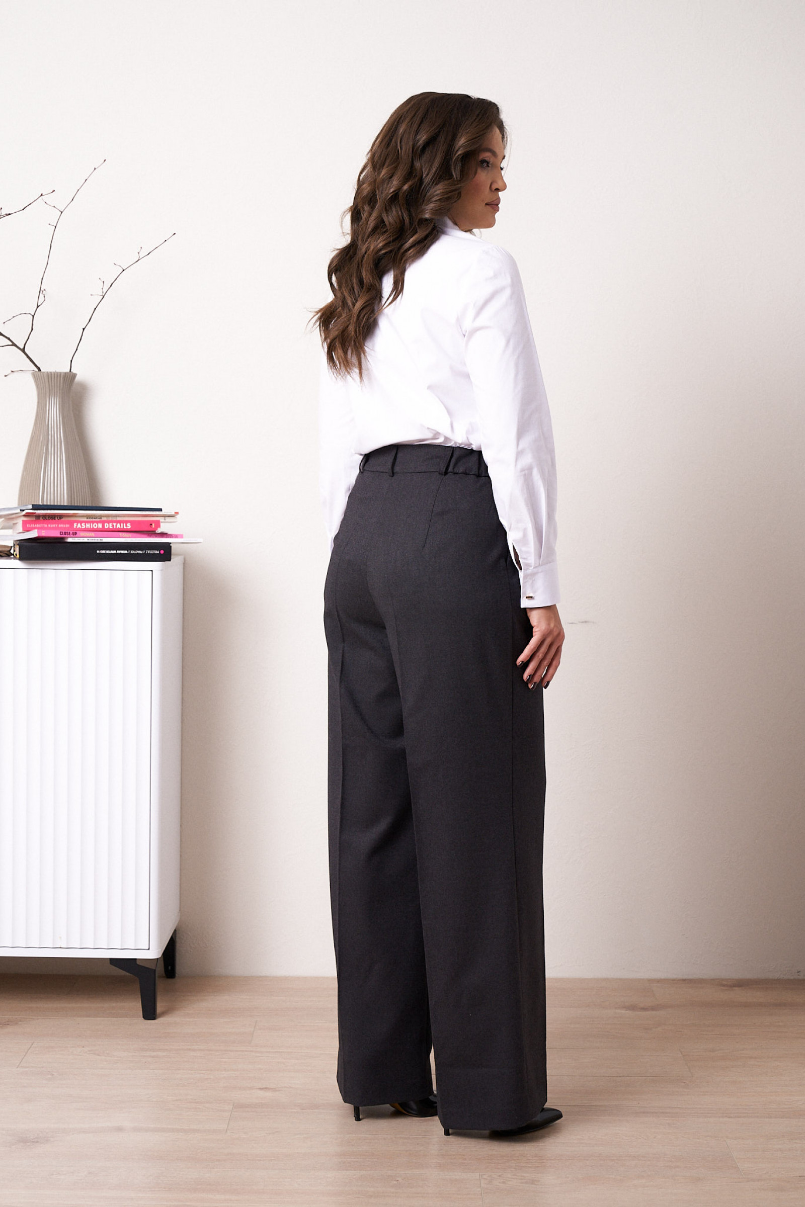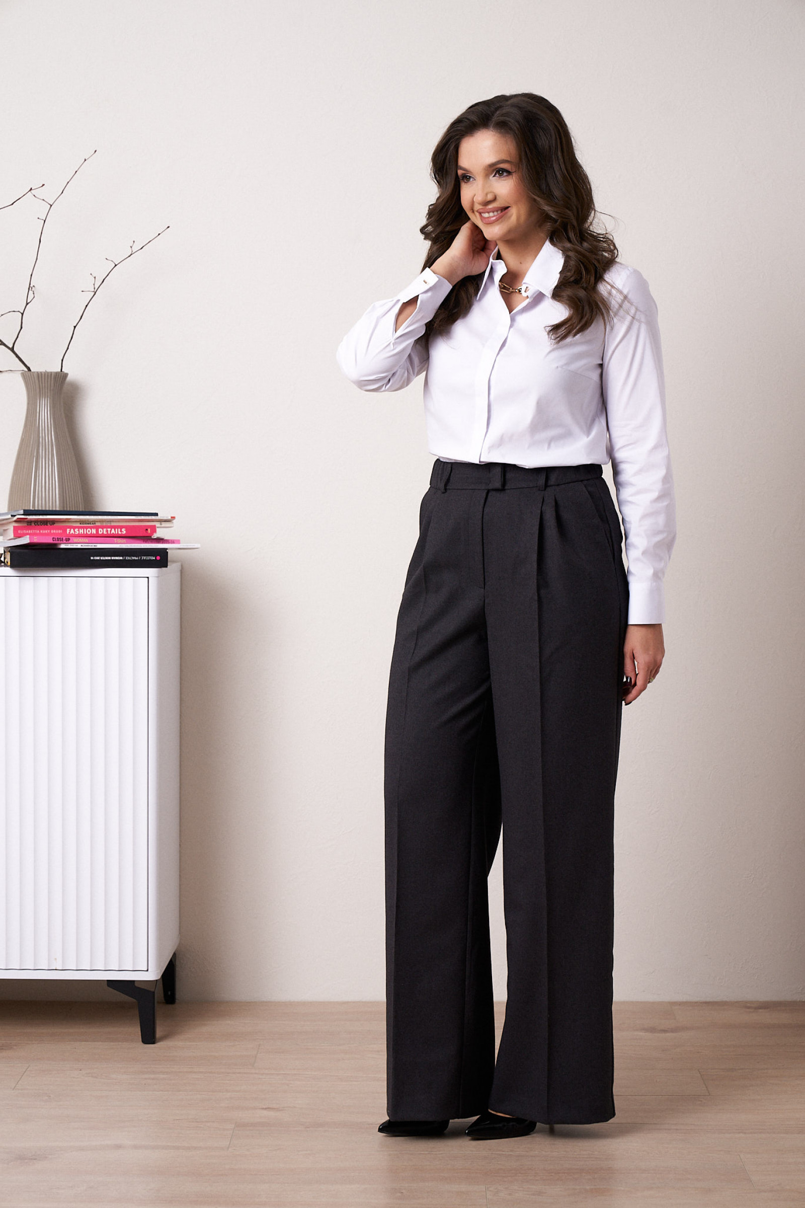 44 Брюки: Высота посадки - 31см, Длина брюк без пояса - 109.5см, Длина по внутреннему шву - 83см, Ширина брючин сверху - 68.5см, Обхват брюк по низу - 56см, Ширина по бедрам - 50см, Ширина по талии - 33см;
