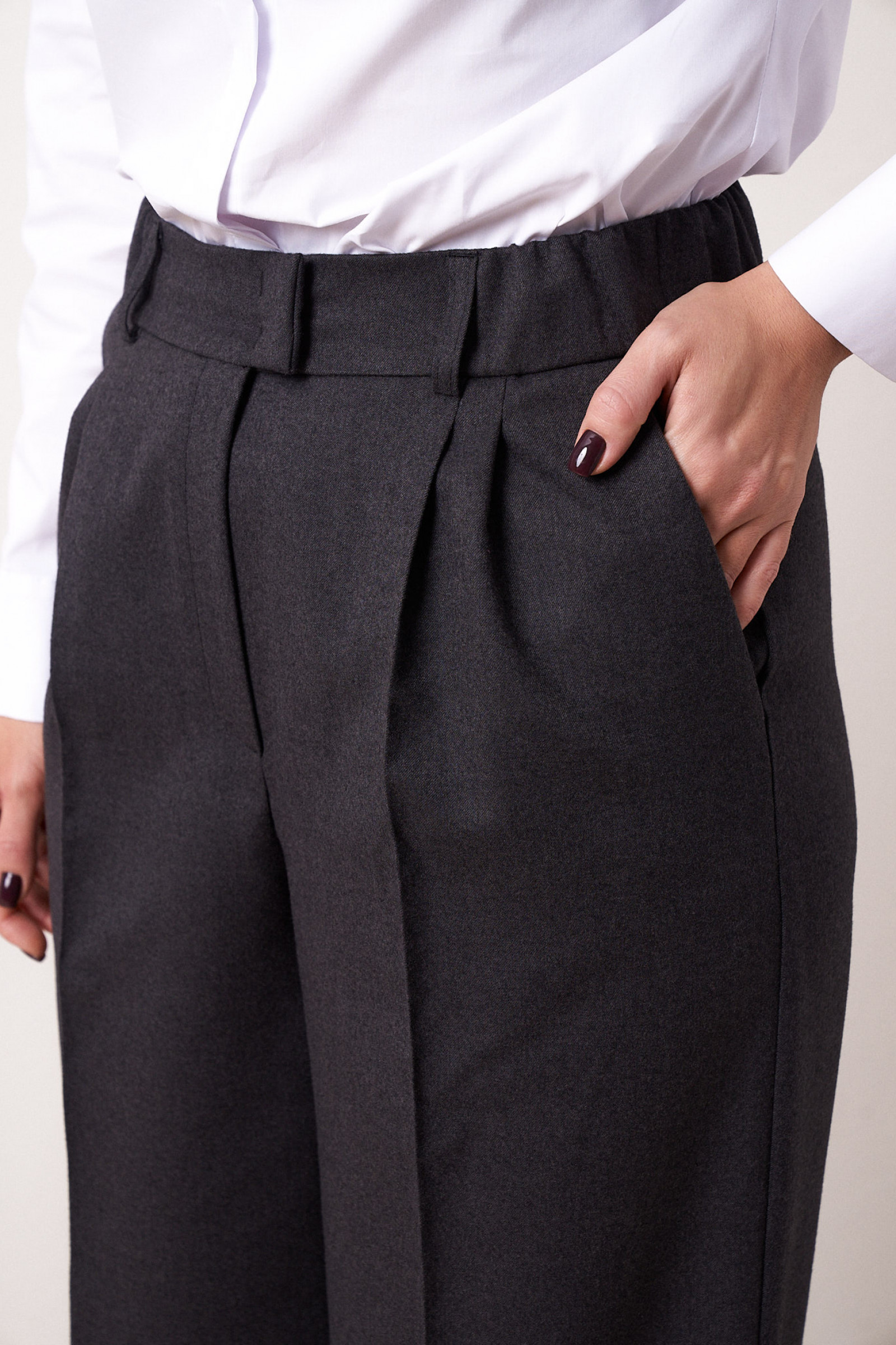 Брюки женские из смесовой ткани для повседневной носки прямого силуэта. Верхний срез брюк обработан притачным поясом со вставками на резинке в боковых частях брюк. Передняя часть брюк имеет четыре талиевые вытачки. Задняя часть брюк имеет две талиевые вытачки. Застежка в брюках на петлю пуговицу, а также на тесьму-молнию в среднем шве брюк. В боковых швах располагаются боковые прорезные карманы с подкройным бочком. Красивые и стильные брюки, в которых вы будете чувствовать себя уверенной.