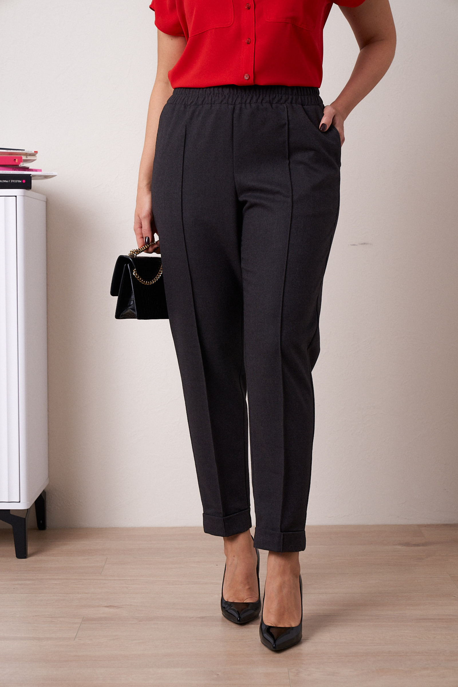 Брюки женские прямые из смесовой ткани для повседневной носки. Верхний срез брюк обработан притачным поясом на резинке. Задняя часть брюк имеет две талиевые вытачки. По низу отложные манжеты, за счёт чего при необходимости можно увеличить длину. В брюках расположен в боковом шве карман с подкройным бочком. Отличный вариант брюк, которые будут гармонично смотреться под любые изделия.
