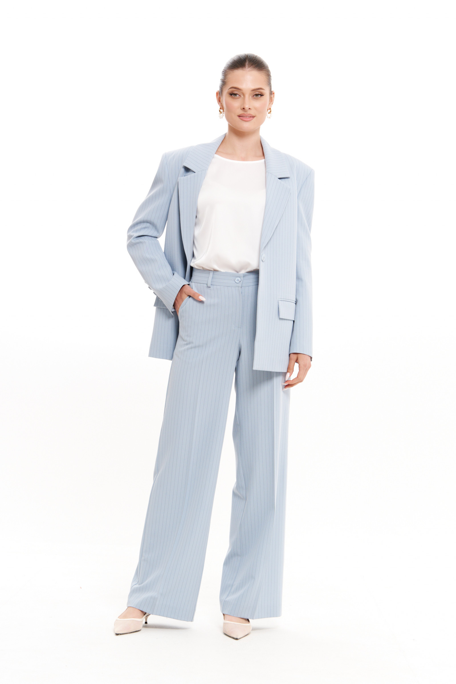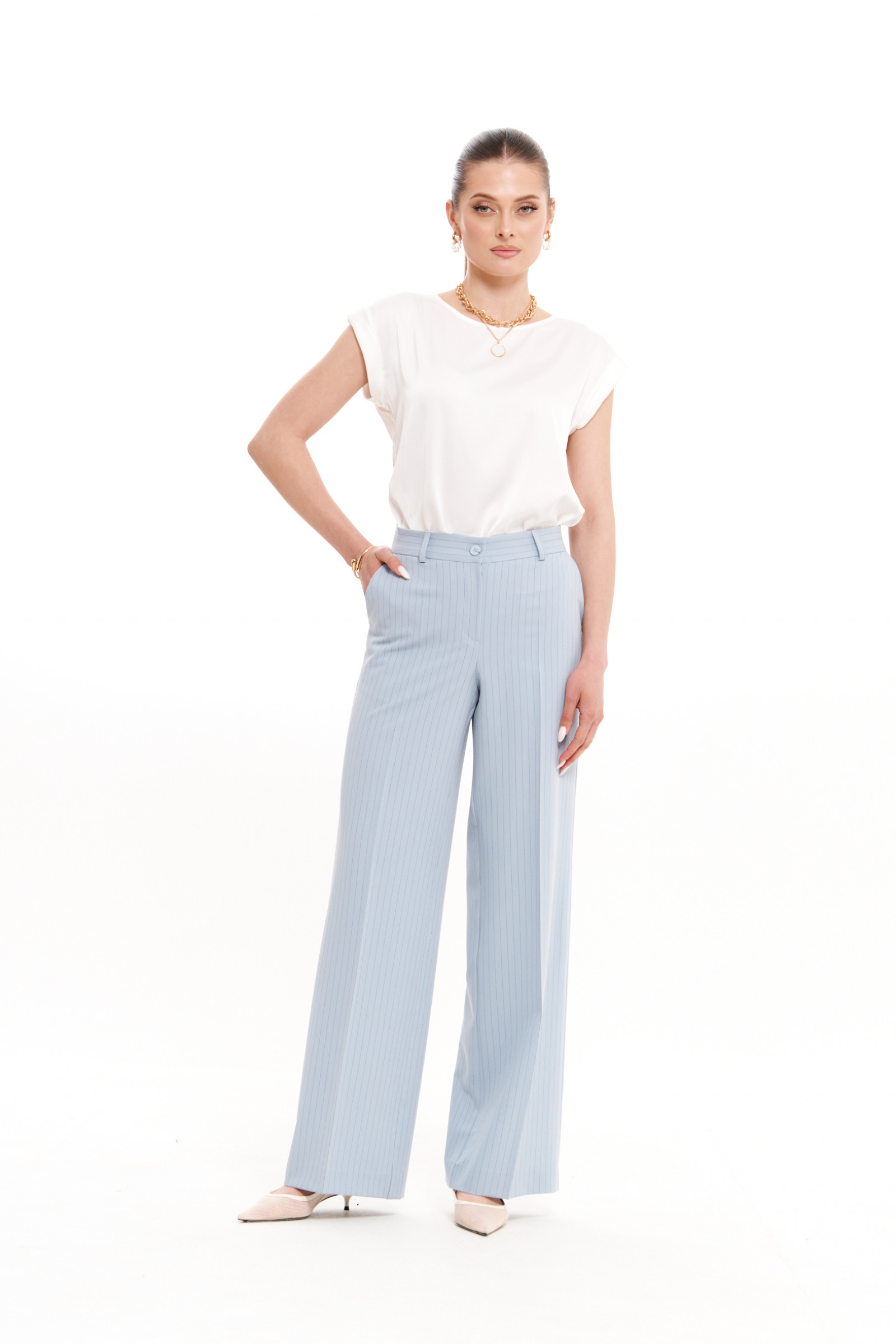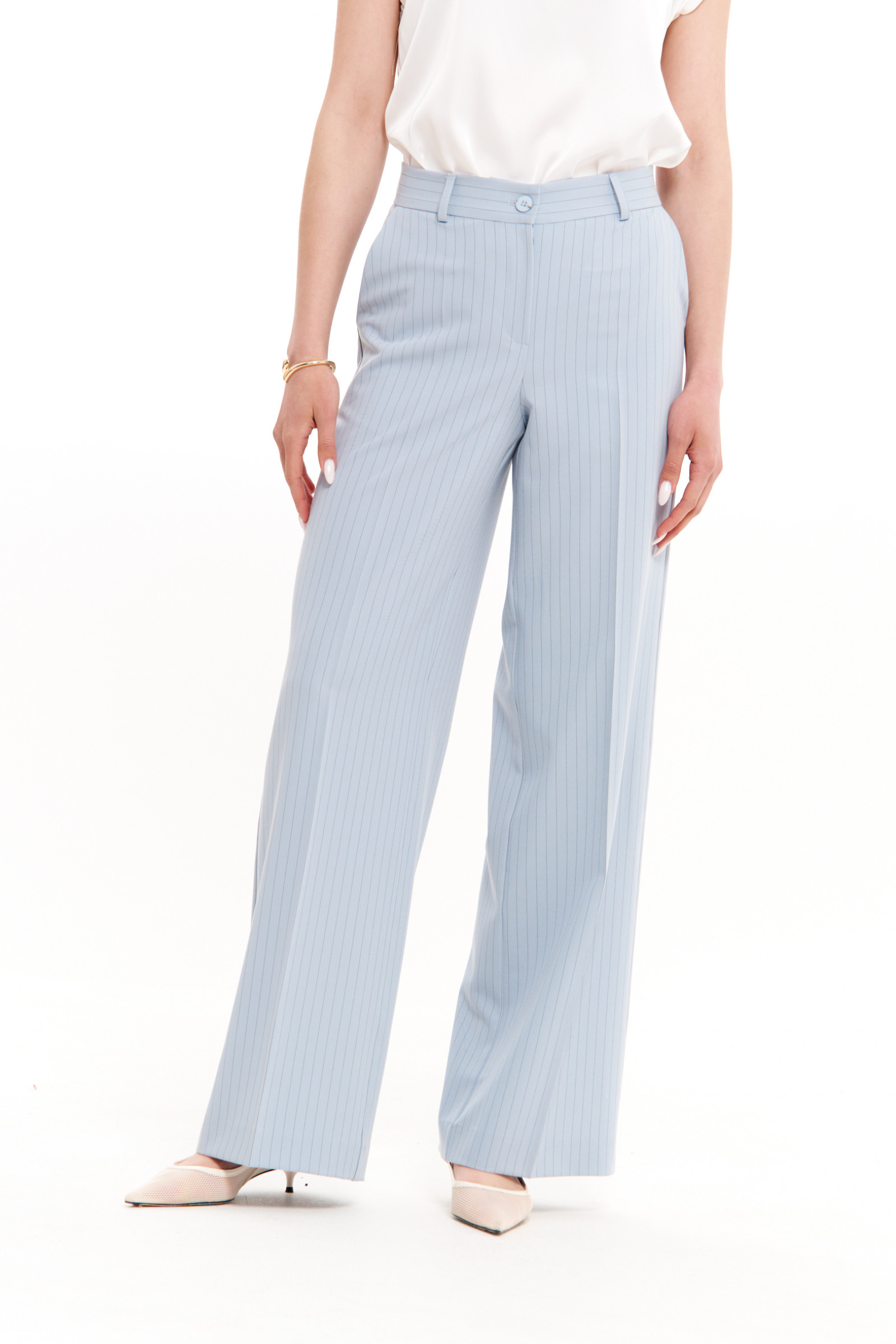 Нежный голубой оттенок делает эти женские брюки стильным акцентом в базовом гардеробе. Они легко комбинируются с блузами, жакетами и топами, подходя для офисного дресс-кода, повседневных прогулок или торжественных мероприятий. Свободный крой обеспечивает комфорт в течение всего дня, а классический фасон сохраняет актуальность в любом сезоне.