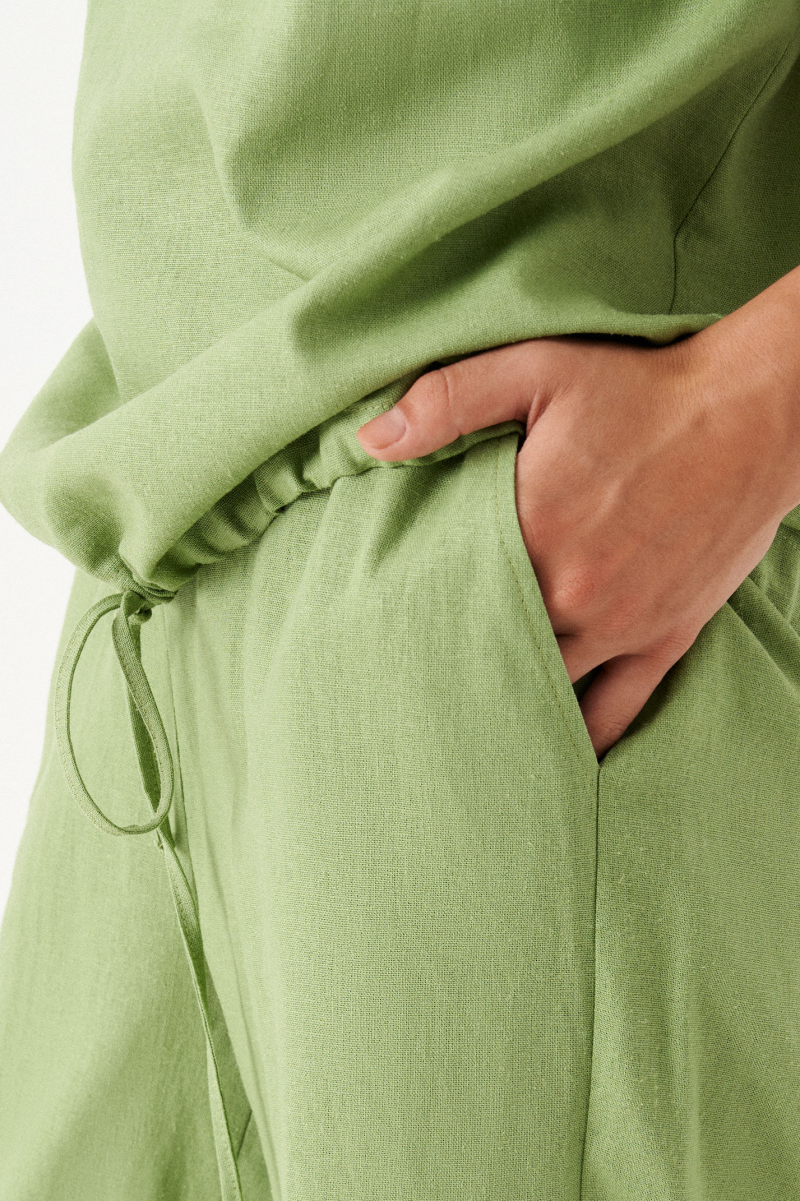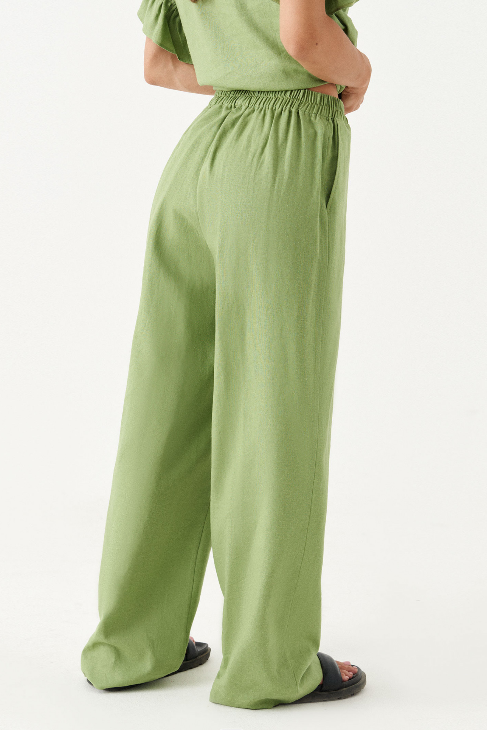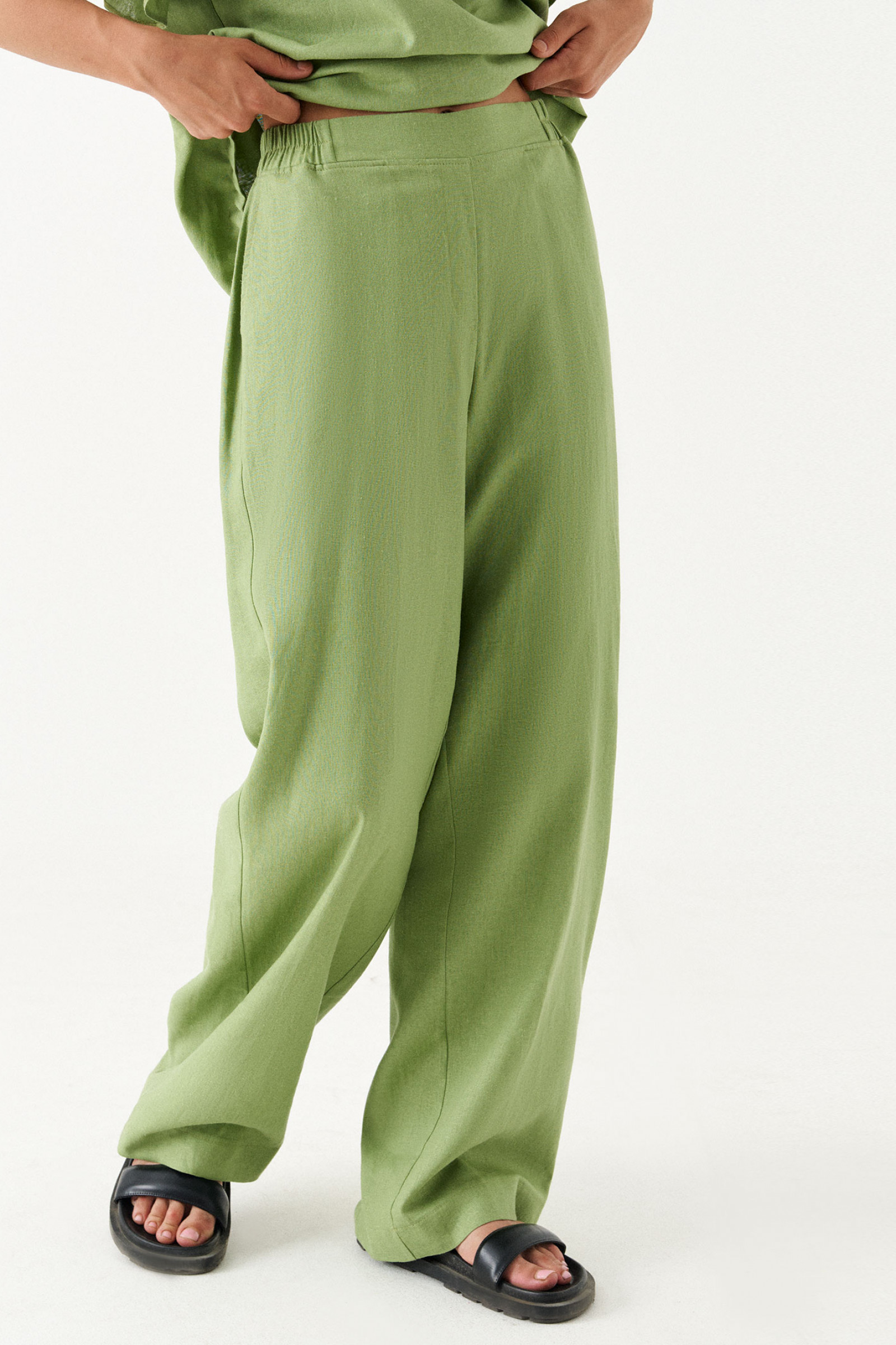 Брюки женские из поливискозной ткани с содержанием льна для повседневной носки и особых случаев. Брюки прямые. Верхний срез брюк обработан притачным поясом со вставкой на резинке, за счет чего брюки будут отлично облегать по вашей фигуре. В области боковых швов располагаются прорезные карманы. Отлично сочетается с блузками, футболками, топами, майками, жакетами. Данные брюки в оливковом оттенке отлично будут смотреться на вас и радовать на протяжении целого дня. Данные брюки отлично будут подходит для жарких дней. Заказывайте летние брюки больших размеров, чтобы пополнить свой сезонный гардероб практичной вещью.