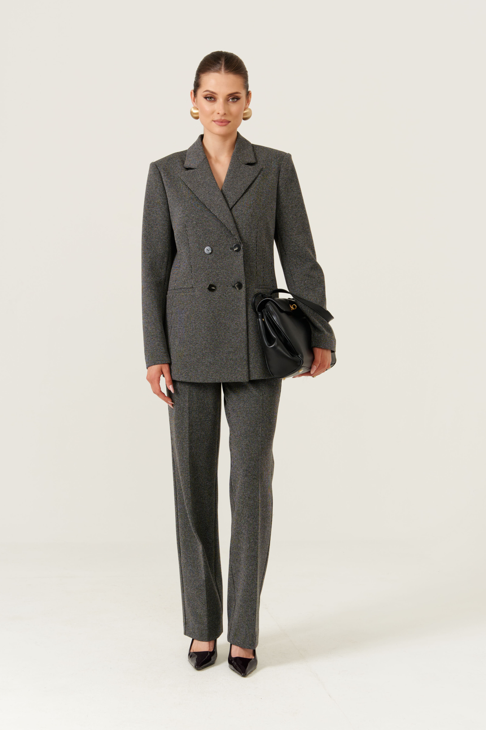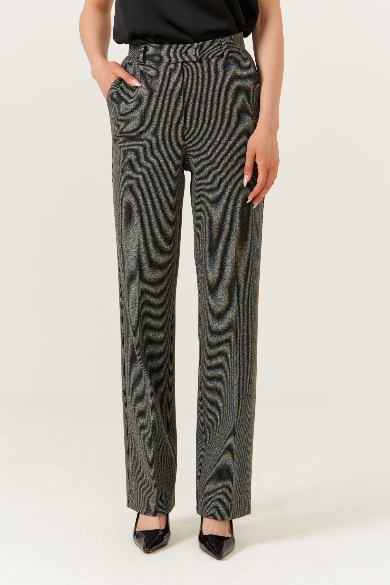 Брюки женские прямые из смесового трикотажного полотна. Верхний срез юбки обработан притачным поясом с застежкой на одну обметанную петлю и одну пуговицу, а также имеется застежка-молния в среднем шве брюк. Срез пояса обработан окантовкой. Пояс со шлёвками, что дает возможность носить брюки под ремень. Задняя часть брюк имеет две талиевые вытачки, а также два прорезных кармана в рамку с двумя обтачками. В боковых швах имеются карманы с подкройным бочком. Брюки отлично подойдут для разного рода мероприятий. Брюки серого оттенка отлично будут смотреться под любой образ и радовать вас каждый день. Данные брюки имеют идеальную посадку за счёт чего они превосходно будут сидеть на любой фигуре.