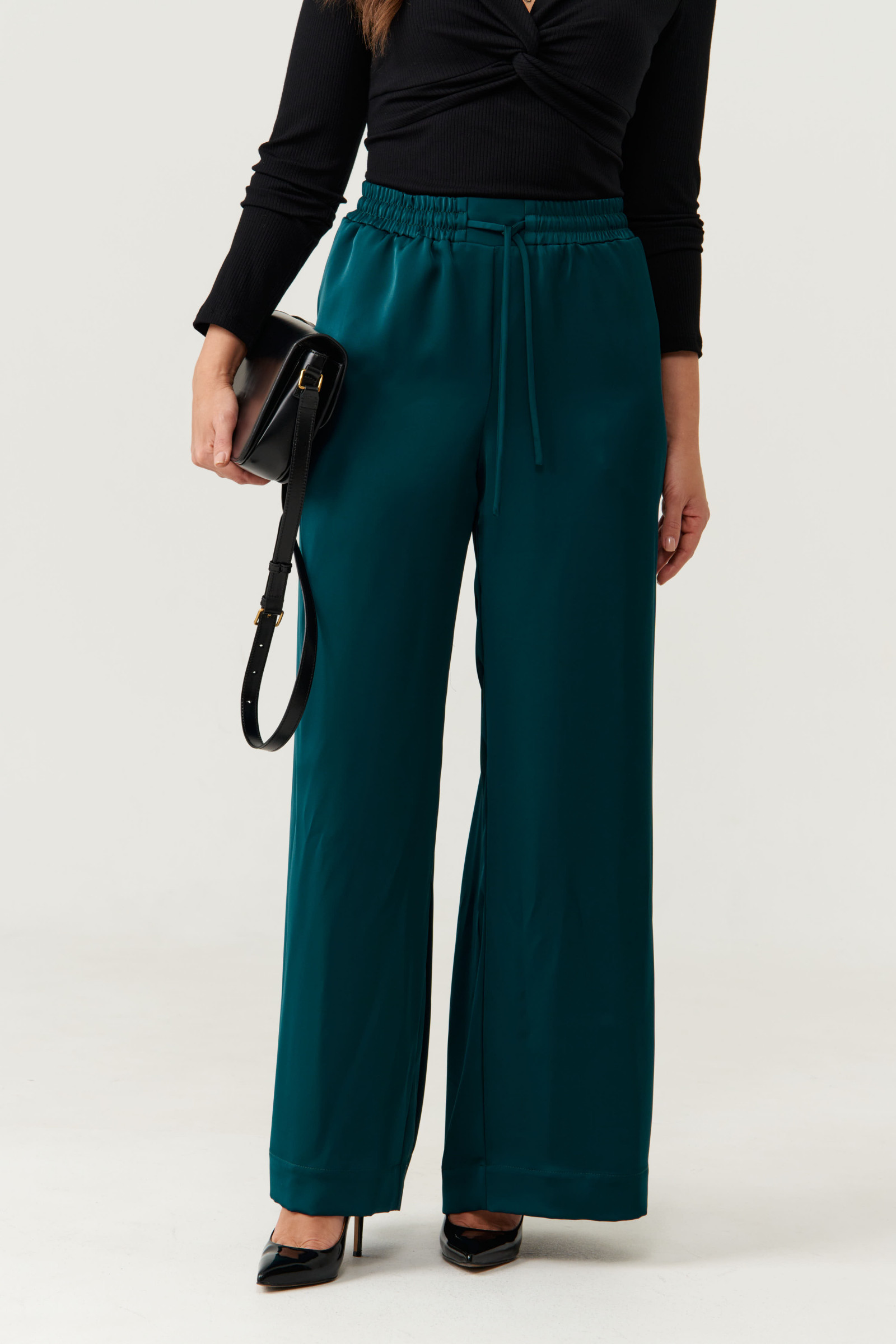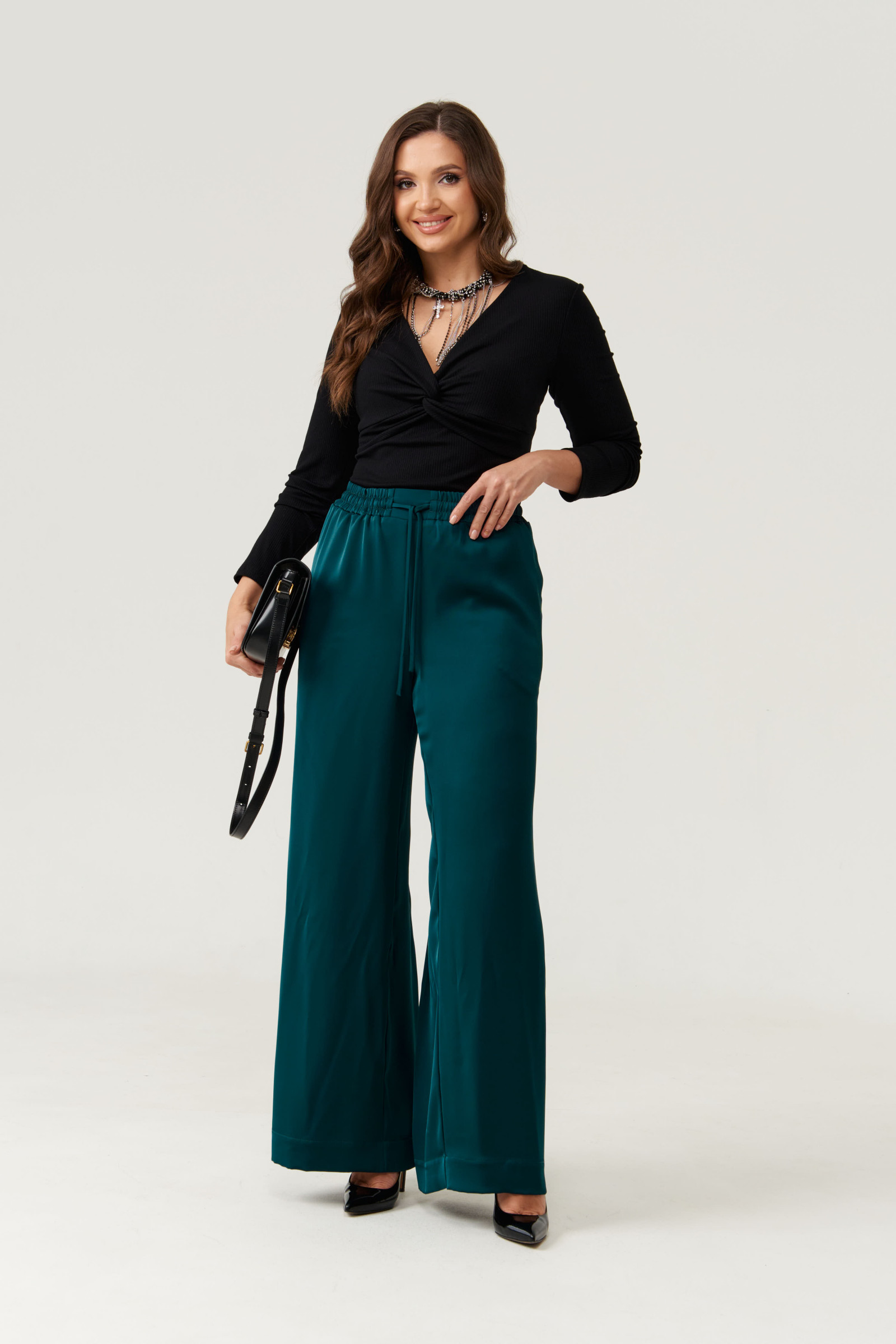 Брюки женские прямые из струящейся атласной ткани. Верхний срез брюк обработан притачным поясом, Пояс на резинке, по переду имеется отрезная прямая часть. В пояс вставлены завязки, за счет чего вы сможете регулировать облегание в области талии. На концах шнурков металлические наконечники. В брюках в боковом шве имеются потайные боковые карманы, что очень удобно. Брюки для повседневной носки либо для торжественных случаев. Модные и очень практичные брюки в изумрудном цвете станут базовой вещью в вашем гардеробе.