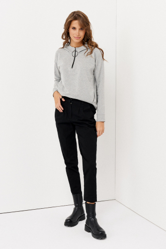Верхний срез брюк обработан притачным поясом с застежкой на крючок и молнией в среднем шве, что обеспечивает надежную посадку и аккуратный внешний вид. Брюки оснащены шлевками, позволяющими дополнительно регулировать посадку по талии. Задняя часть украшена четырьмя талиевыми вытачками, которые создают хорошую посадку и подчеркивают фигуру.