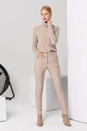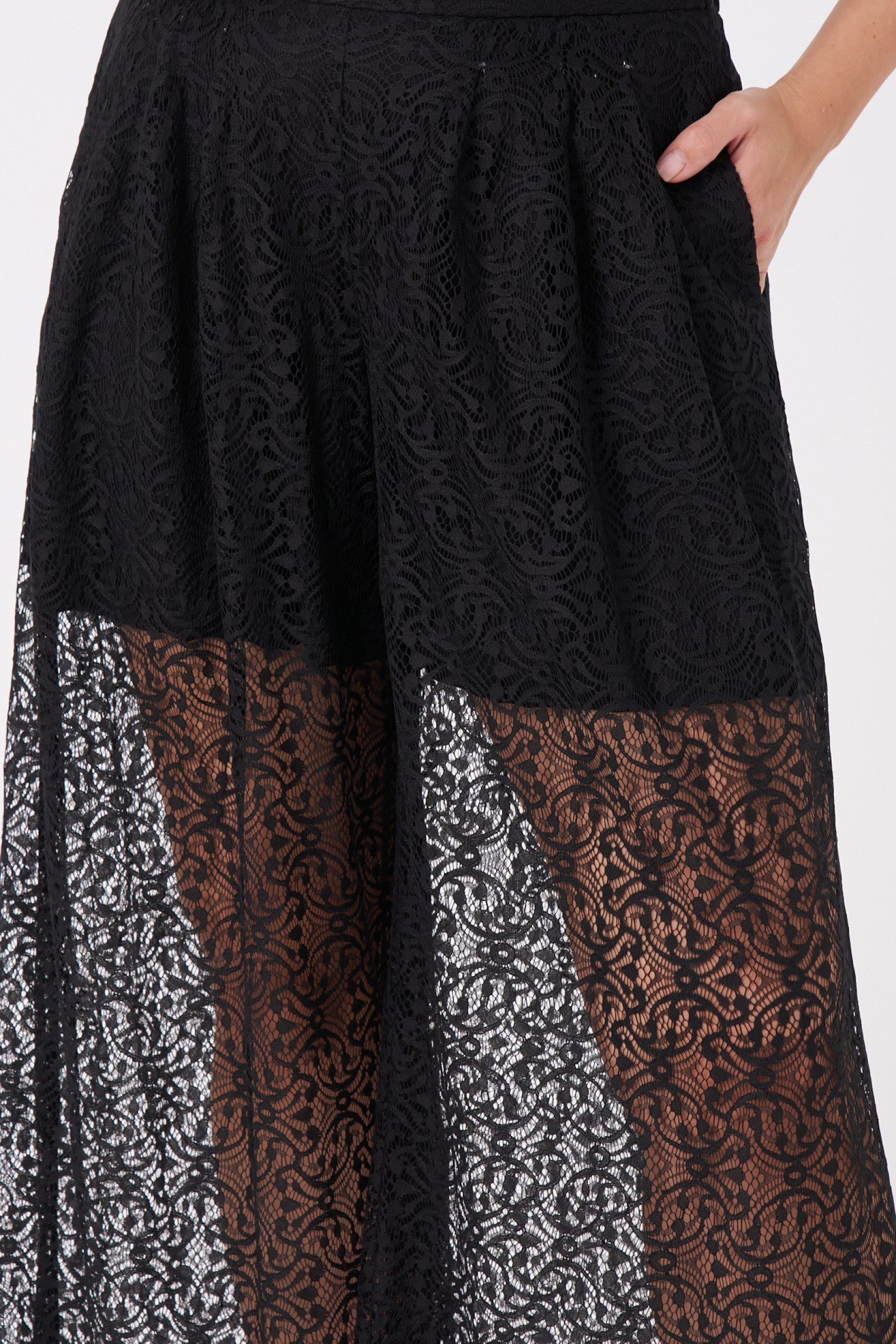 Брюки выполнены из изысканной кружевной ткани, которая придает образу романтичность и женственность. Верхний срез брюк оформлен притачным поясом, обеспечивающим хорошую посадку и аккуратный внешний вид. В задней части пояса расположена вставка на резинке, что делает модель более удобной и эластичной, позволяя легко адаптироваться к разным фигурам и обеспечивая комфорт в движении. Передняя часть брюк украшена мягкими складками, которые визуально удлиняют ноги и добавляют образу изящества и утонченности. В боковом шве располагаются боковые карманы. Такой дизайн делает брюки универсальным и элегантным элементом гардероба, идеально сочетающимся с различными топами и обувью.