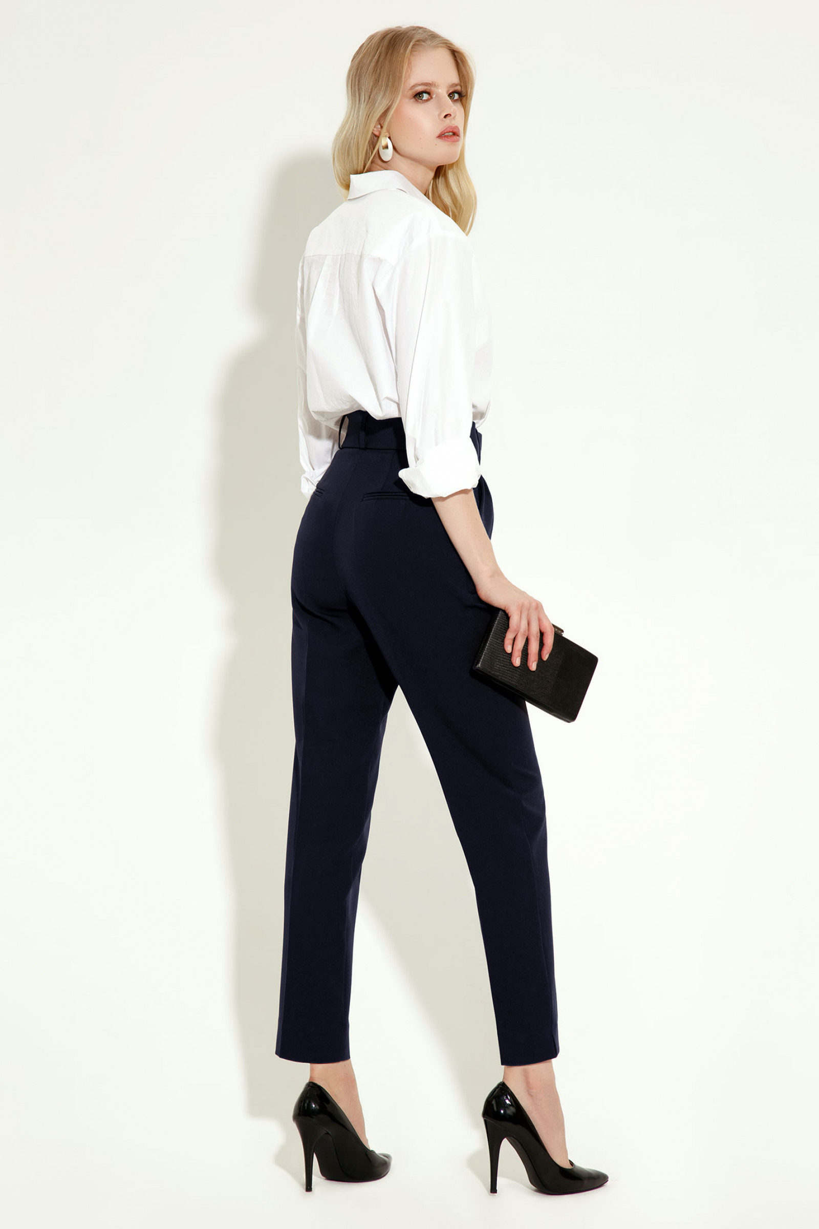 46 Брюки: Высота посадки - 31.5см, Длина брюк без пояса - 97см, Длина по внутреннему шву - 73.5см, Ширина брючин сверху - 66см, Обхват брюк по низу - 34см, Ширина по бедрам - 51.5см, Ширина по талии - 36.5см;
