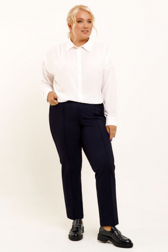 Брюки женские прямые из смесовой ткани для повседневной носки. Верхний срез брюк обработан притачным поясом, застежка на один крючок, а также имеется застежка на тесьму-молнию в среднем шве брюк. В брюках имеются шлевки, что дает возможность носить их под ремень. Задняя часть брюк имеет четыре талиевых вытачек. В брюках расположен в боковом шве карман с подкройным бочком. Отличный классический вариант брюк, которые будут гармонично смотреться под любые изделия.