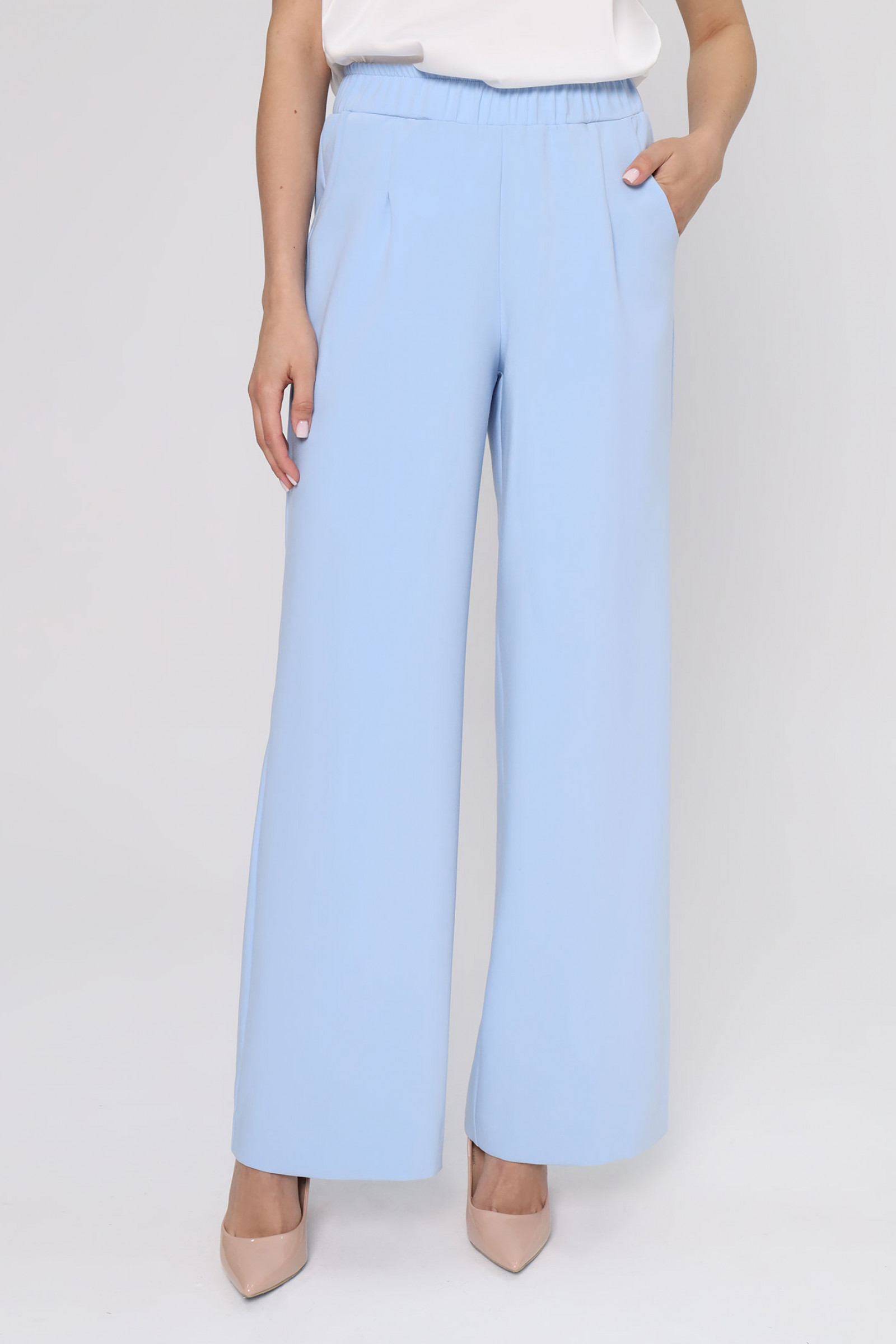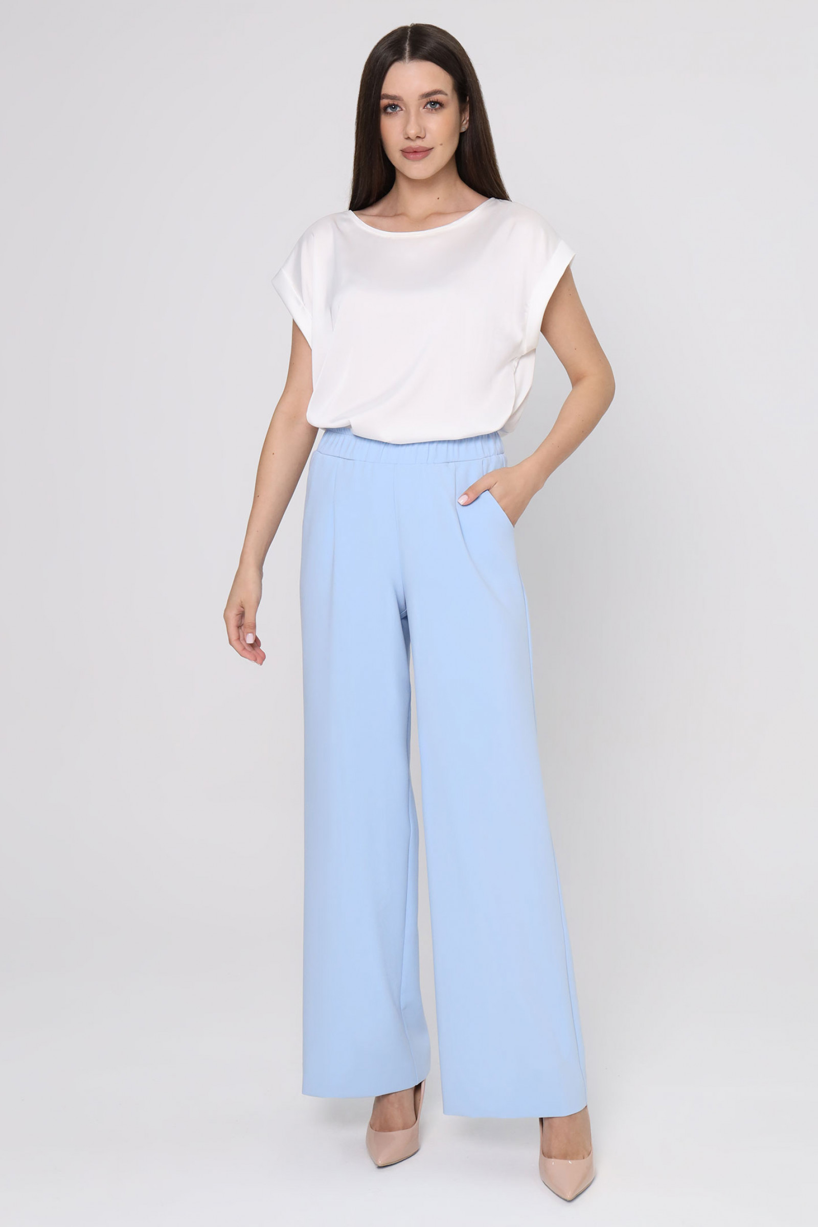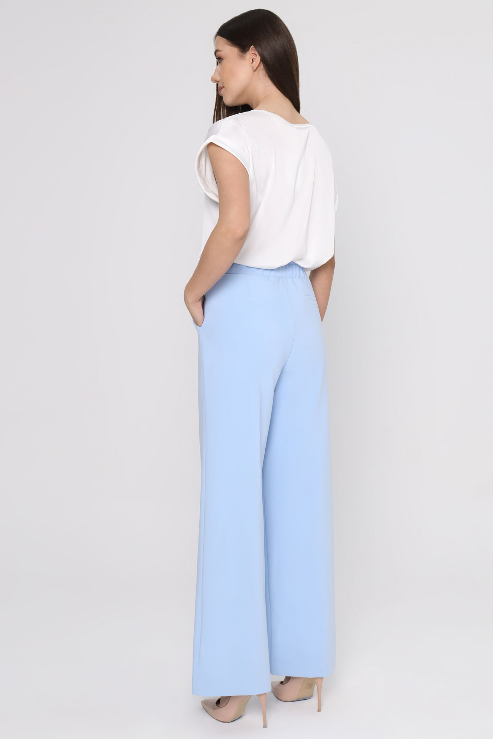 Женские брюки из поливискозной ткани идеально подходят для повседневной носки. Верхний срез обработан притачным поясом со вставкой на резинке, обеспечивающим комфортную посадку. Пояс дополнен шлевками, что позволяет носить их с ремнем для дополнительной регулировки. Передняя часть украшена двумя талиевыми вытачками, создающими аккуратный силуэт. Задняя часть также оснащена двумя талиевыми вытачками, а также имеется карман с листочкой и лейблом с логотипом бренда. Эти брюки белого оттенка сочетают стиль и практичность, делая их универсальным элементом гардероба.