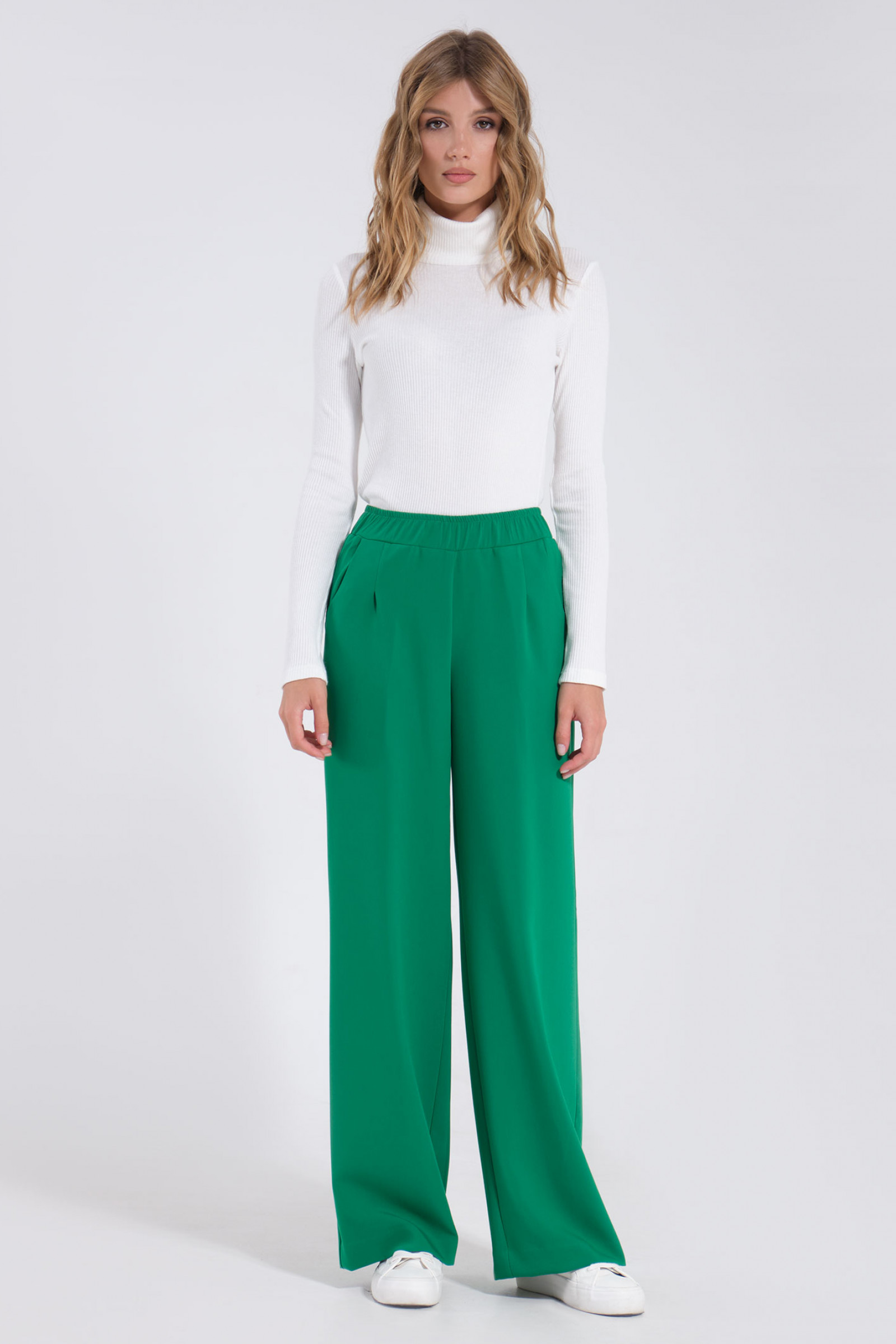Женские брюки из поливискозной ткани идеально подходят для повседневной носки. Верхний срез обработан притачным поясом со вставкой на резинке, обеспечивающим комфортную посадку. Пояс дополнен шлевками, что позволяет носить их с ремнем для дополнительной регулировки. Передняя часть украшена двумя талиевыми вытачками, создающими аккуратный силуэт. Задняя часть также оснащена двумя талиевыми вытачками, а также имеется карман с листочкой и лейблом с логотипом бренда. Эти брюки белого оттенка сочетают стиль и практичность, делая их универсальным элементом гардероба.