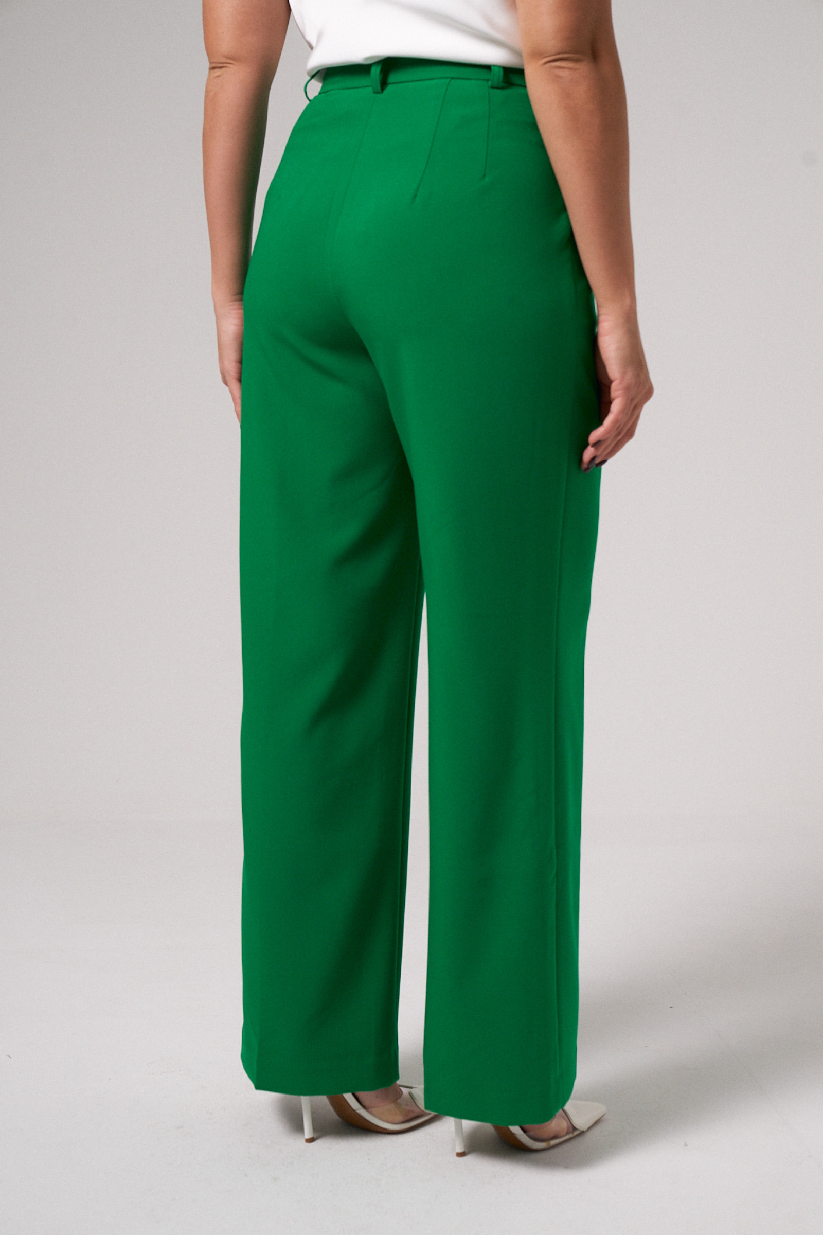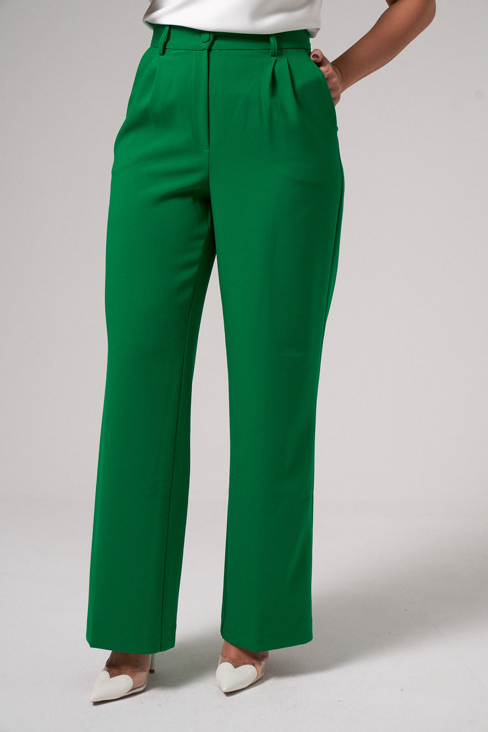 Брюки женские из поливискозной ткани. Брюки прямые классические. Они универсальны в комбинациях с верхней одеждой. Особенности их кроя: высокая посадка, свободный фасон, прорезные карманы в боковых швах, складки и стрелки от пояса, шлевки для ремня, застежка-молния в среднем шве брюк и обметанная петля и пуговица. С ними гармонично сочетаются топы, блузки, свитера, жакеты, водолазки и гольфы. Хорошо подходят брюки женские для офиса, деловых встреч, прогулок по городу, посещения общественных мест. Модная модель брюк в зеленном оттенке, в которой вы будете выглядеть эффектно и элегантно.