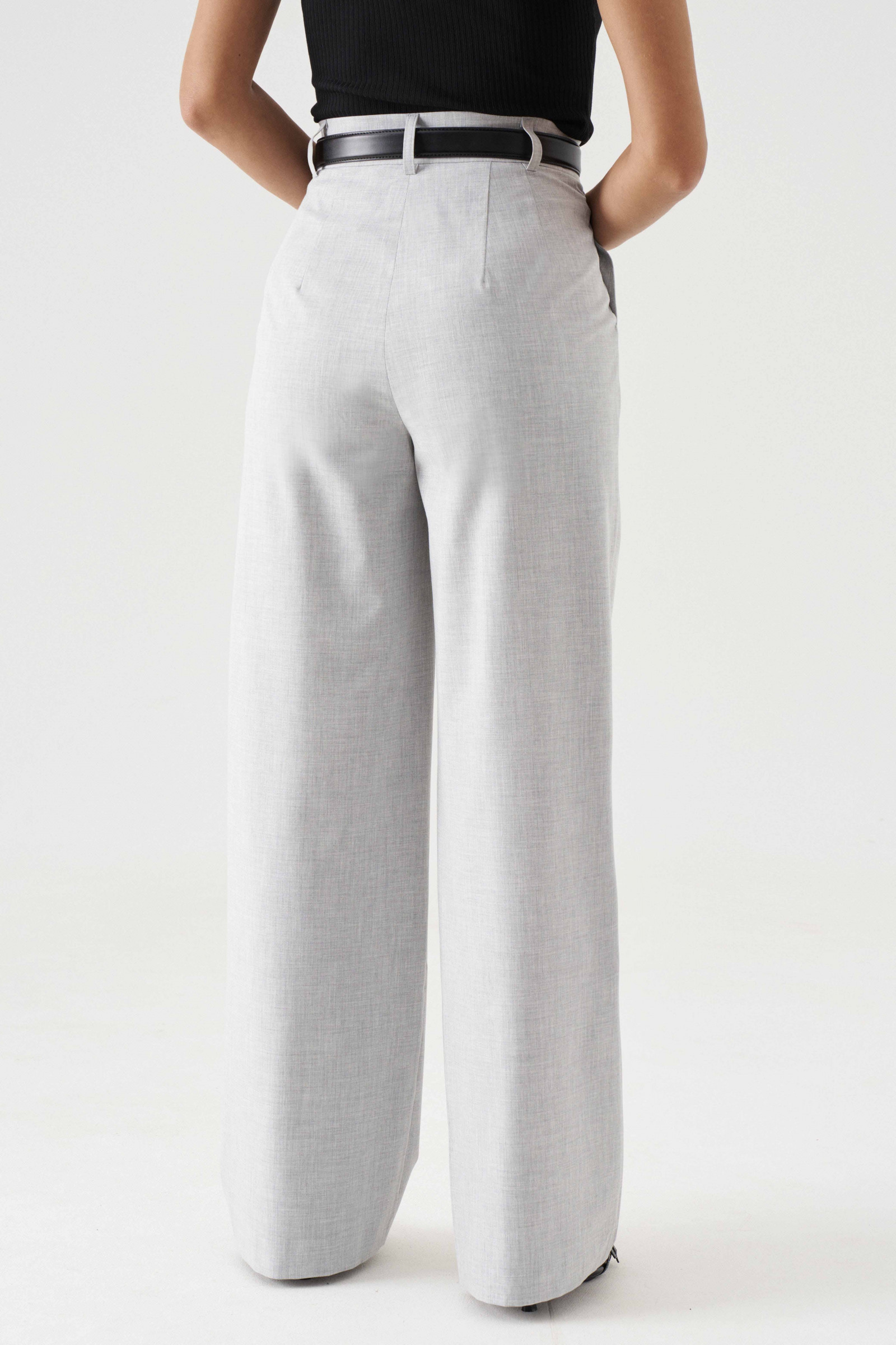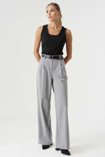 Однотонные брюки женские классические клеш пошиты из приятной на ощупь, плотной поливискозной ткани. Особенности их кроя: высокая посадка, свободный фасон, прорезные карманы в боковых швах, складки и стрелки от пояса, шлевки для ремня, застежка-молния и пуговица.