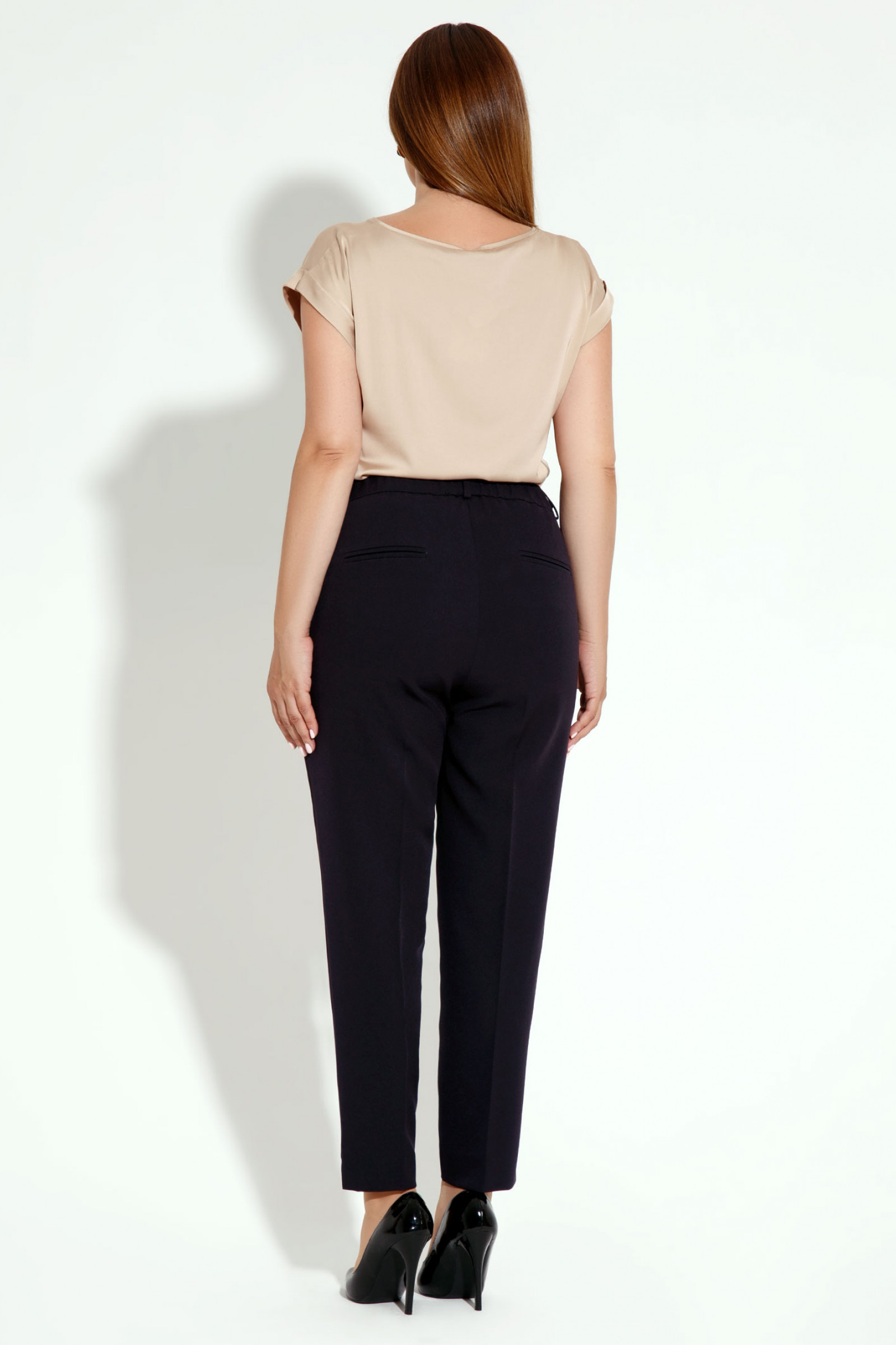Брюки женские укороченные со средней посадкой не обтягивают ноги, не стесняют движений. Основными особенностями их кроя являются небольшие разрезы в нижней части боковых швов, резинка по поясу на спинке, прорезные карманы спереди.