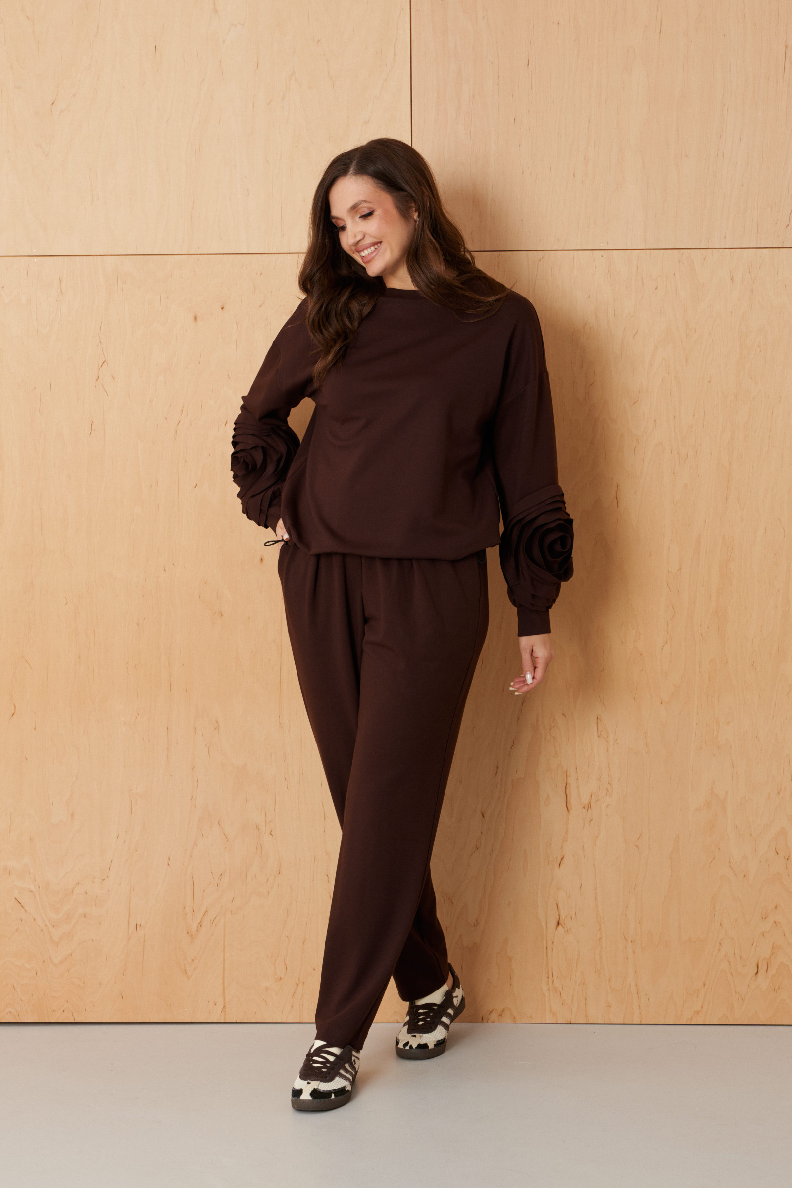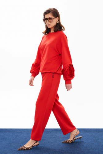 58 Брюки: Высота посадки - 34см, Длина брюк без пояса - 95см, Длина по шаговому шву - 73см, Ширина брючин сверху - 80см, Обхват брюк по низу - 46см, Ширина по бедрам - 70см, Ширина по талии - 48см;
