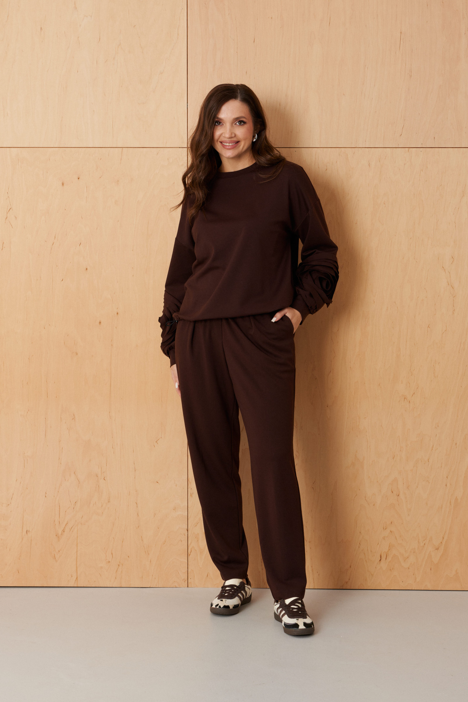 Эти женские брюки выполнены из смесового трикотажного полотна и предназначены для повседневной носки. Модель прямого кроя обеспечивает комфорт и универсальность. Верхний срез брюк обработан притачным поясом на резинке, что позволяет идеально прилегать к любой фигуре и регулировать посадку. Брюки имеют имитацию застежки, создавая аккуратный и стильный внешний вид. Передняя часть украшена складкой, добавляющей изящества и легкости образу. В боковом шве расположен потайной карман с подкройным бочком, обеспечивающий практичность и удобство. Бордовый оттенок придает брюкам яркий и насыщенный вид, делая их привлекательным элементом гардероба. Эти брюки отлично подчеркнут вашу индивидуальность и будут привлекать восхищенные взгляды.