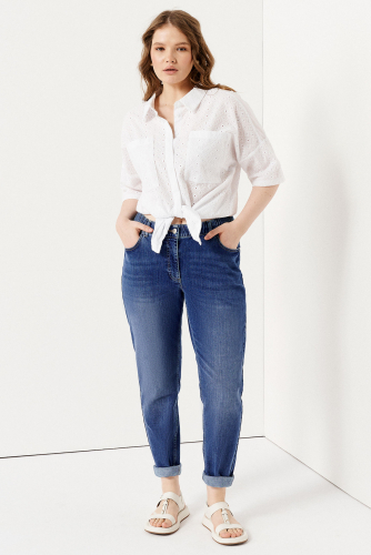 50 Брюки: Высота посадки - 27.5см, Длина брюк без пояса - 100см, Длина по шаговому шву - 75см, Ширина брючин сверху - 56см, Обхват брюк по низу - 27см, Ширина по бедрам - 47см, Ширина по талии - 40см;