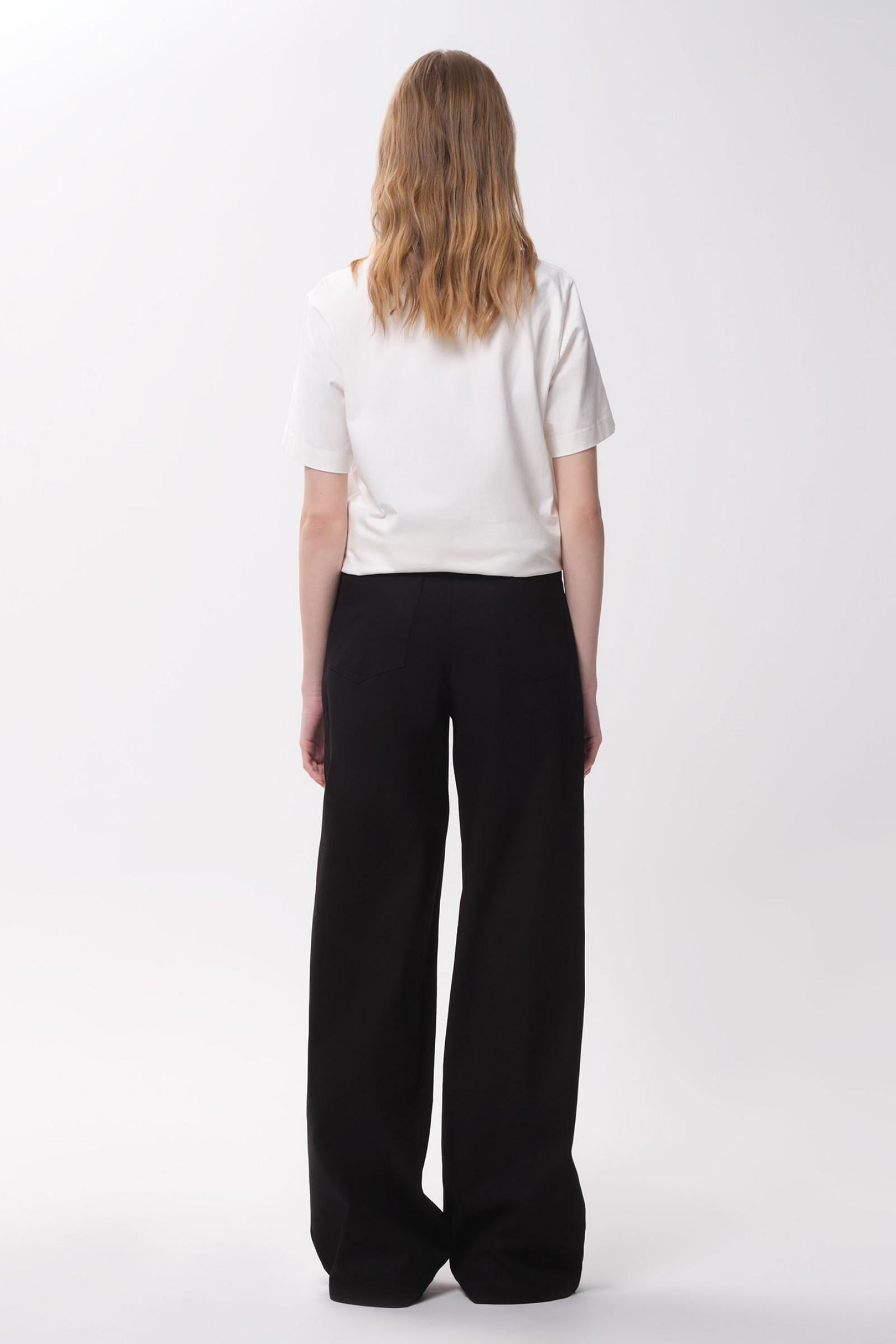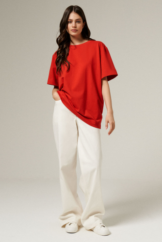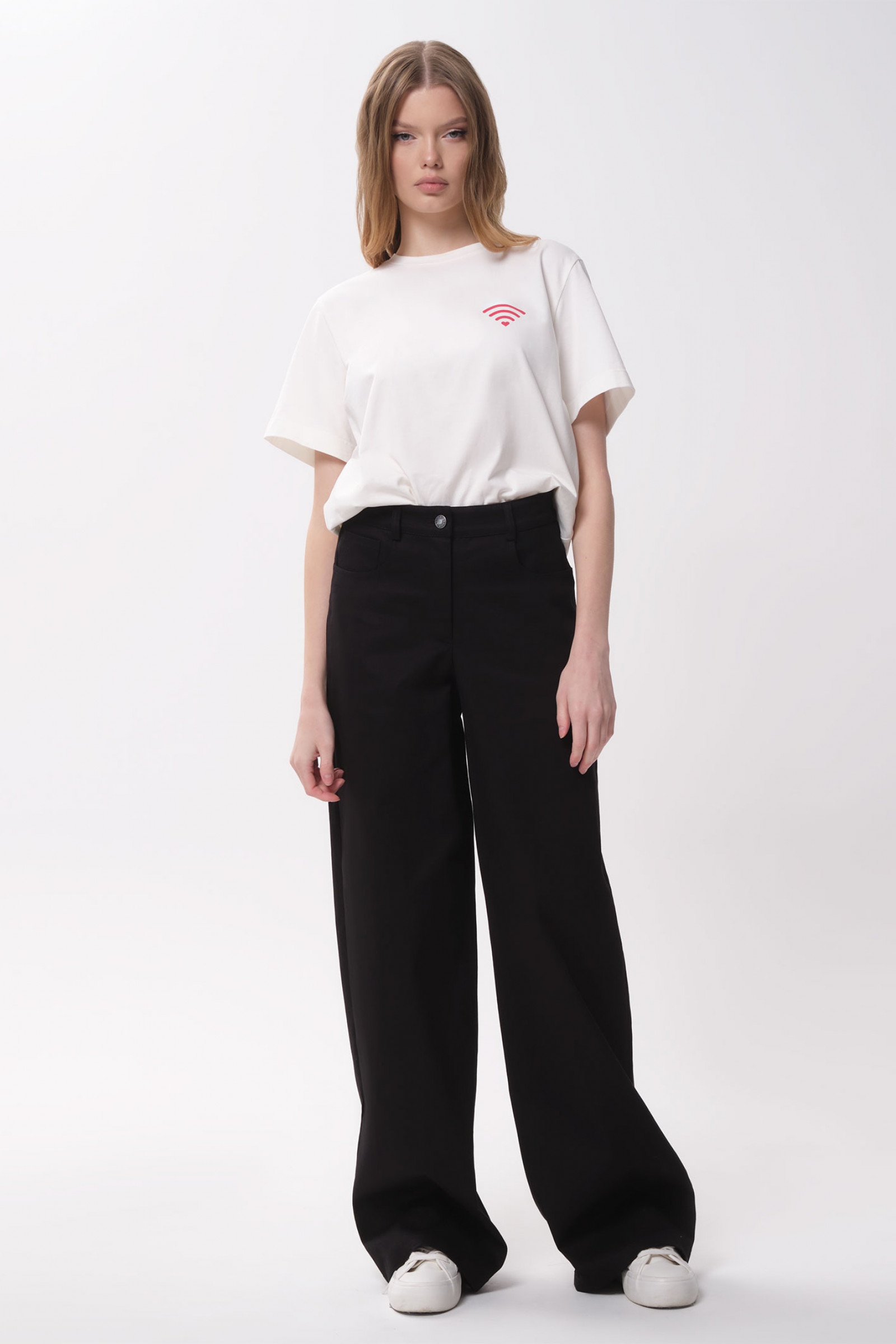 Брюки женские прямые из смесовой ткани для повседневной носки. Верхний срез брюк обработан притачным поясом, застежка на одну обмётанную петлю и одну пуговицу, а также имеется застежка на тесьму-молнию в среднем шве брюк. Задняя часть брюк имеет две талиевые вытачки и два накладных кармана. В брюках расположен в боковом шве карман с подкройным бочком. Отличный классический вариант брюк, которые будут гармонично смотреться под любые изделия.